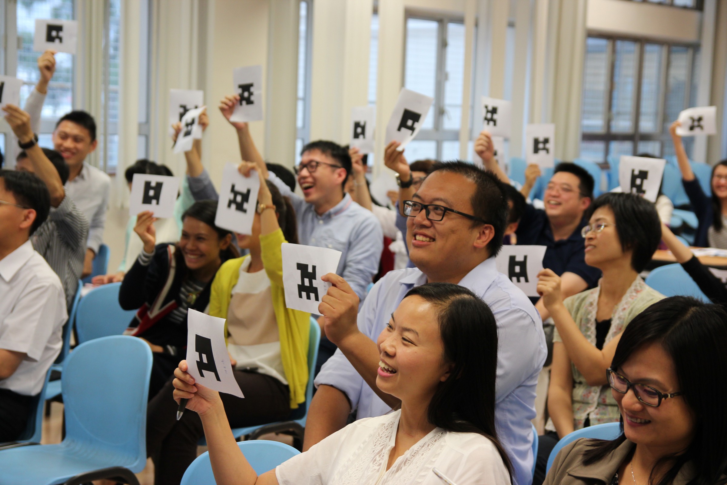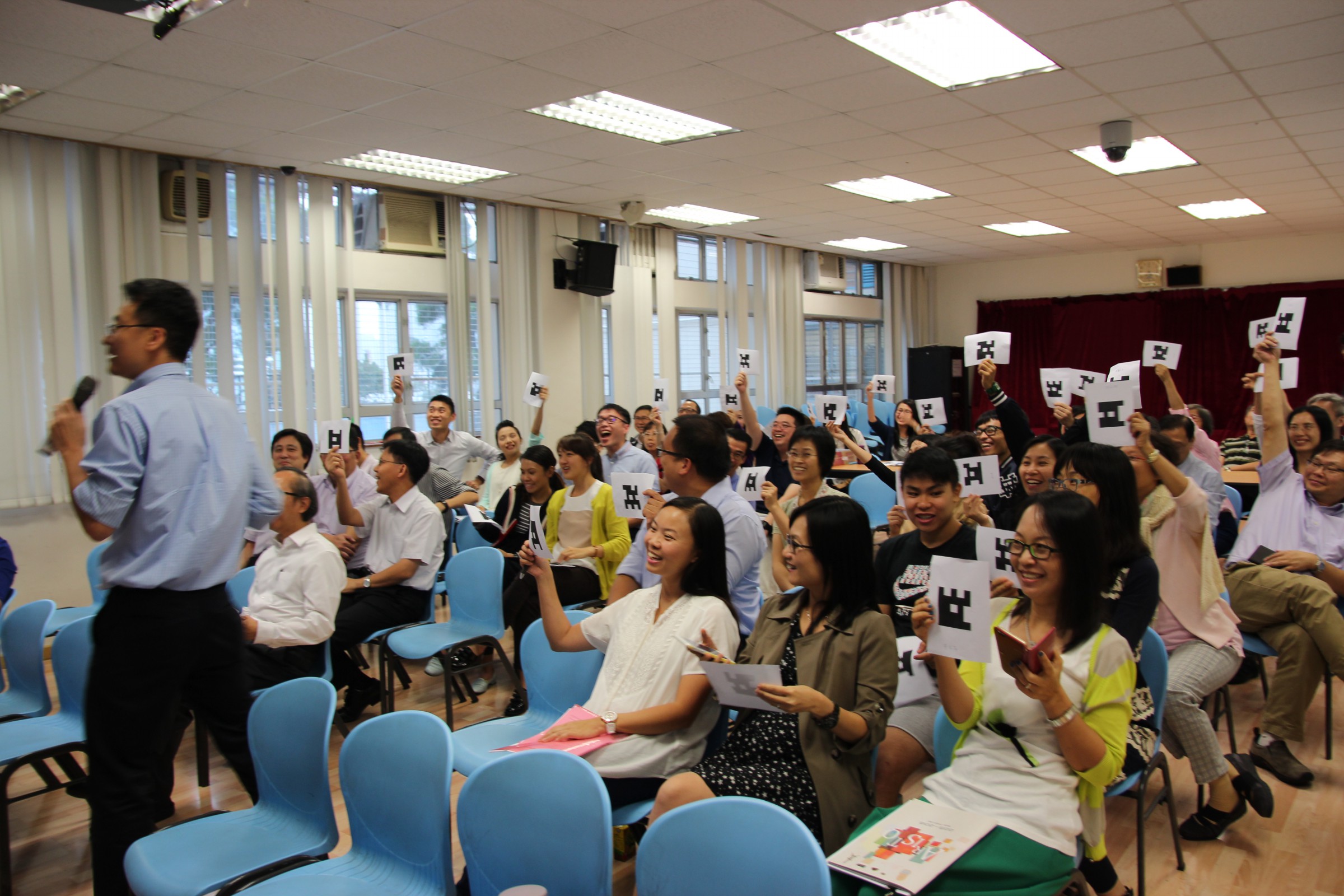 本校於11月13日進行了第四次職員會議,會上林達強老師與林瑞安老師為我們試範了電子教學的方法和好處。林達強老師用平版電腦進行Power lesson,能即時上傳錄音和照片,並可作手寫回應,這方便了學生分組閱讀網上資料,亦幫助老師進行課後評估,大大提升教學素質。林瑞安老師則運用Plickers進行教學試範,Plickers硬件要求低,只需一部電話便可以進行。老師在課堂上運用Plickers,可以即時統計資料,準確知道學生的學習難點,快捷地評估學生個人的學習成果,有利學生學習。