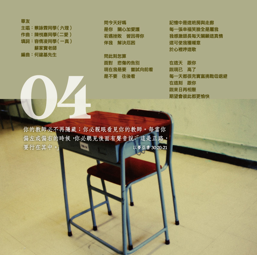 主唱:藍沛儀同學 作曲:藍沛儀同學 填詞:藍沛儀 陳惠珊同學 編曲:何建基先生