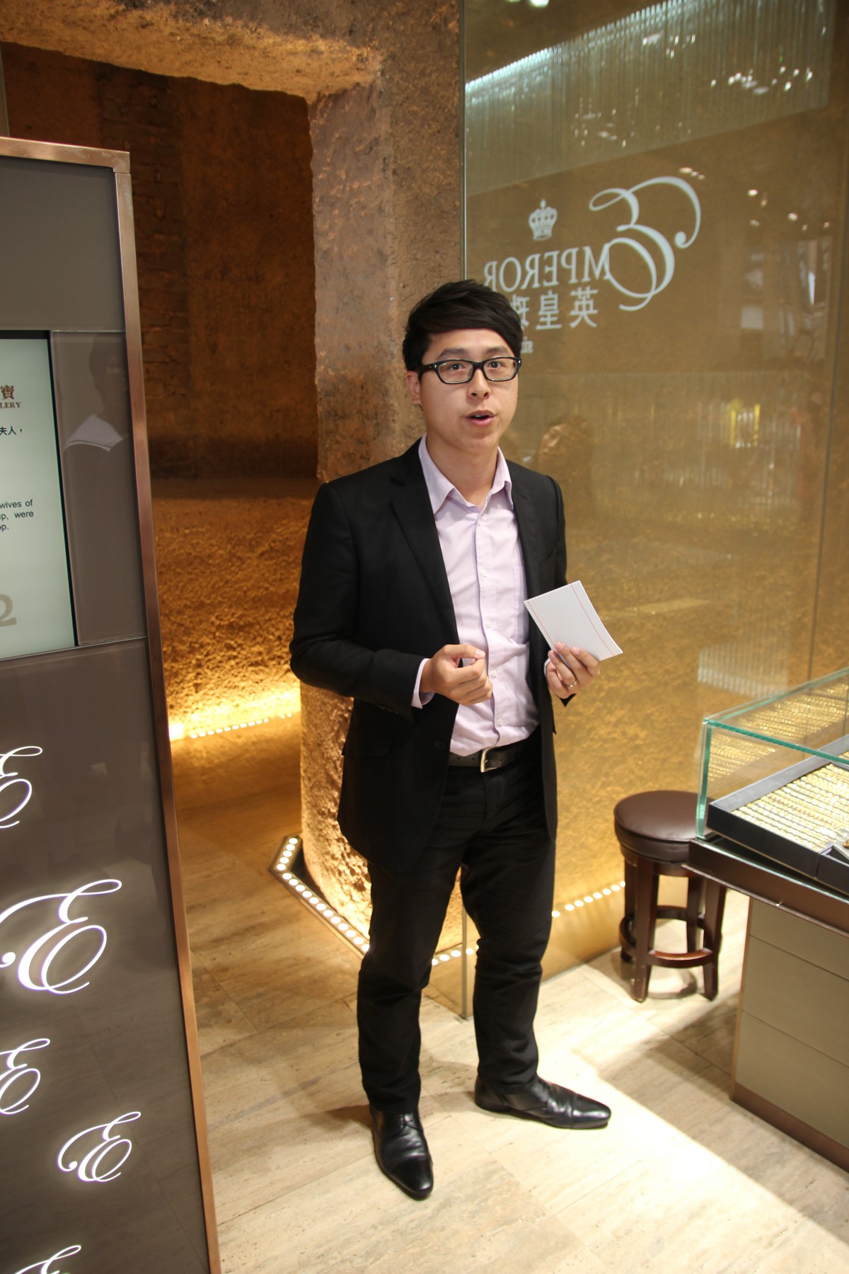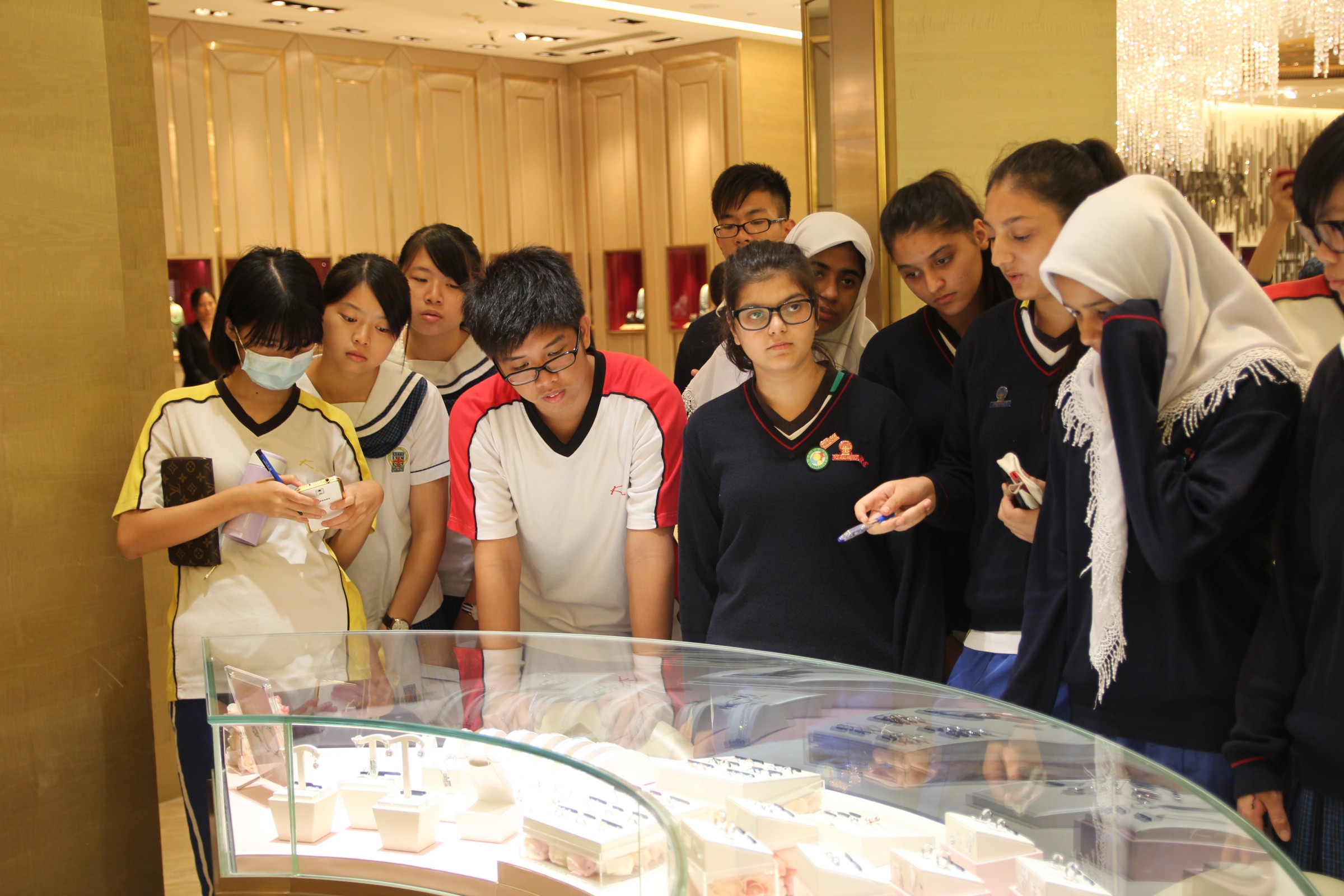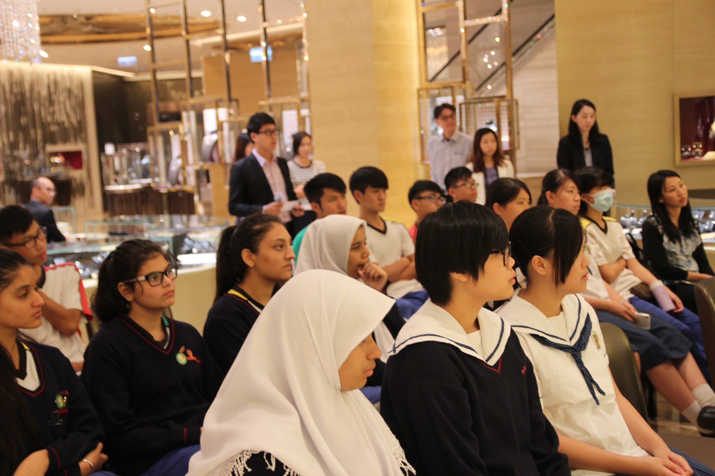 由英皇珠寶市場部職員為同學介紹英皇集團由經營鐘錶業起家,到英皇集團現時涉獵不同業務,包括娛樂、傳媒、地產、摶彩等。及後帶領同學參觀店鋪,店內設有金器、翡翠、鑽飾的各個珠寶展示專區。最後由人事部職員為同學講述現時鐘錶珠寶零售業的前景、入職的要求、途徑和晉升機會,希望同學可以積極裝備自己,在未來日子抓緊機遇走出自己的康莊大道。