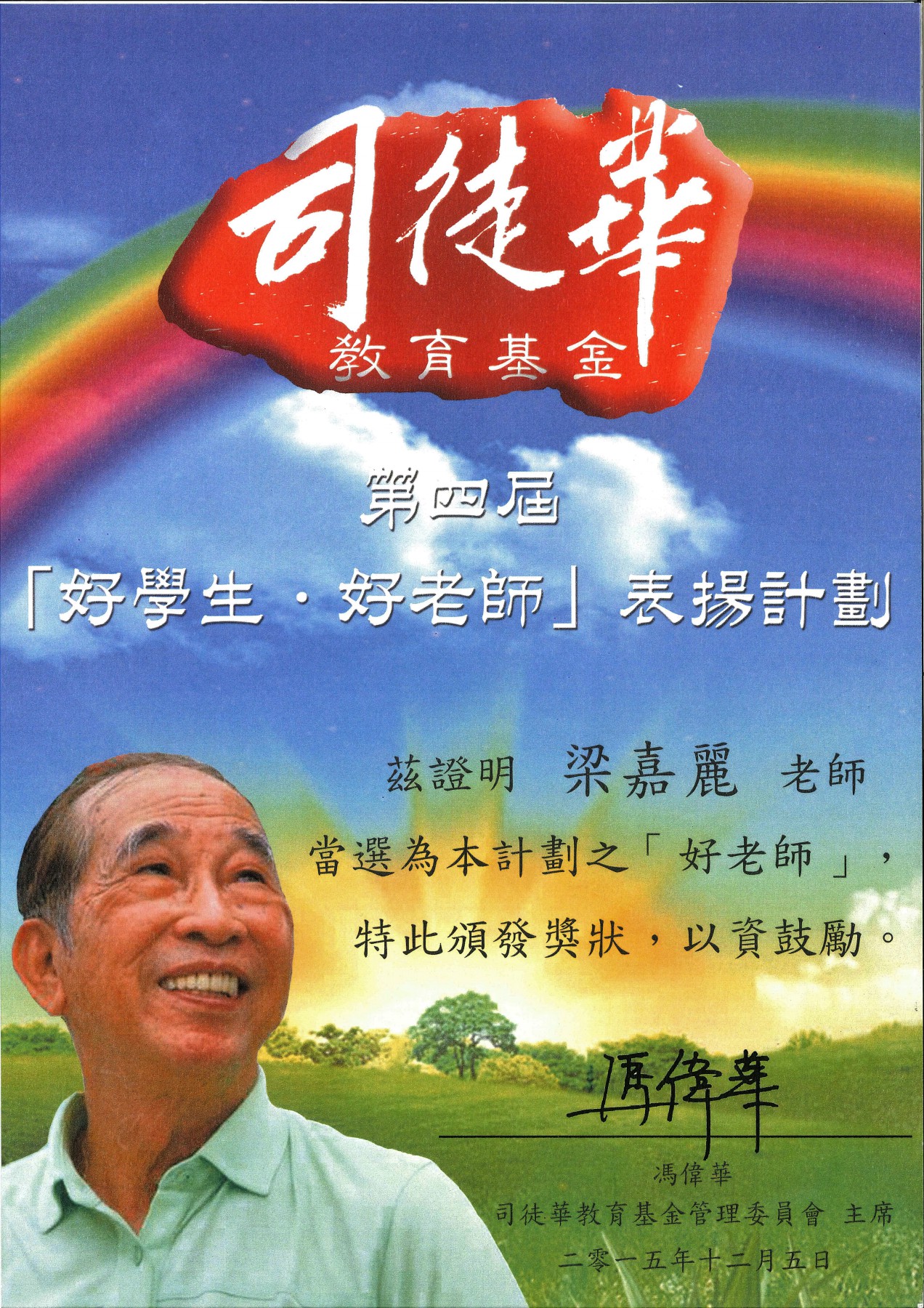 > 梁嘉麗老師獲司徒華教育基金「好老師表揚計劃」表揚獎