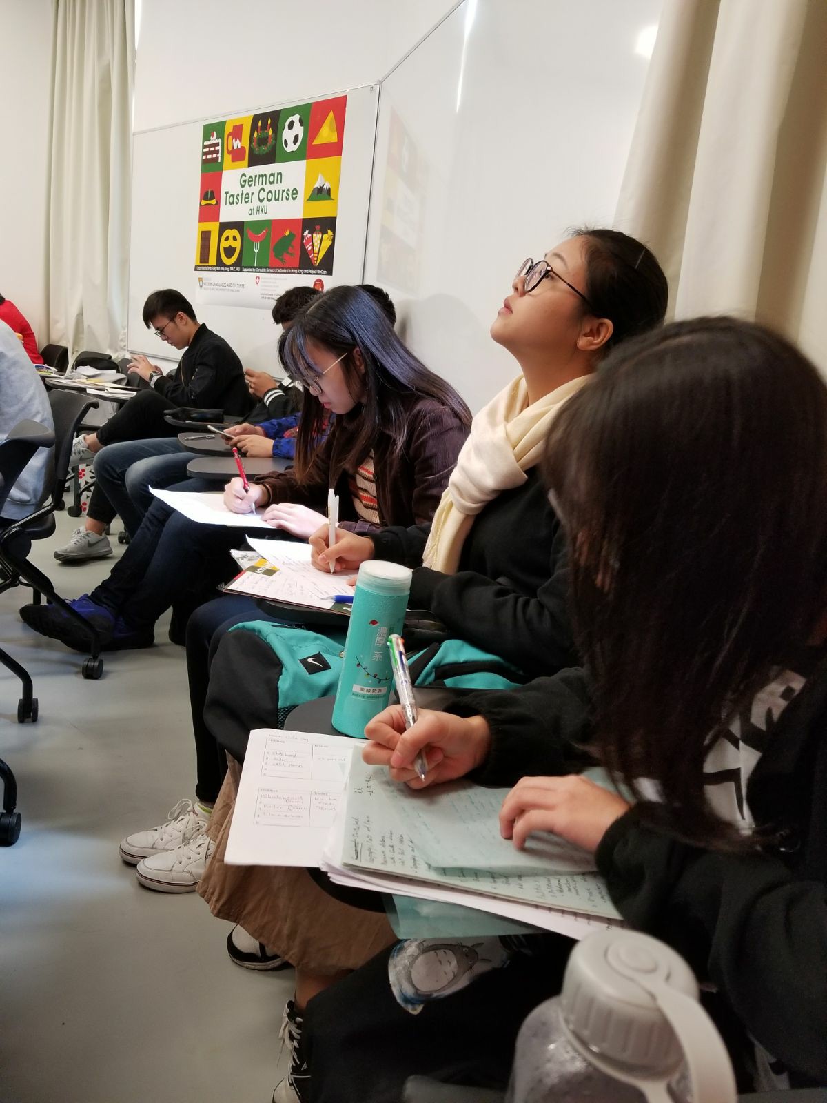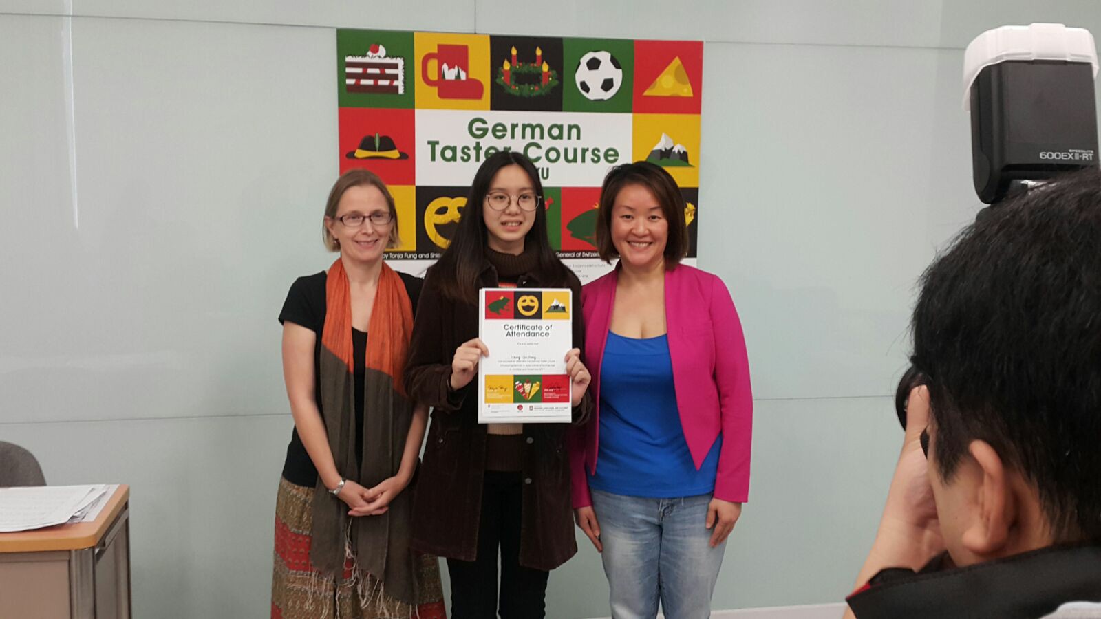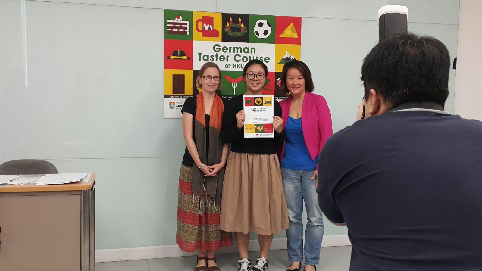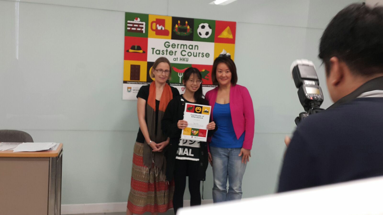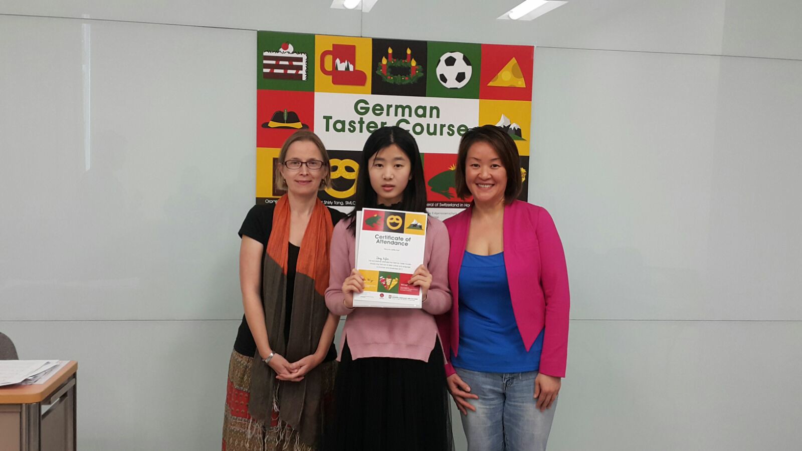 本校有4位同學參加由學校起動計劃、瑞士領土館及香港大學舉辦,為期六節的德國與瑞士文化及語言課程,時光飛逝,今天是最後一節課堂,在導師們悉心設計的課堂裡,將德國不同的文化和日常生活的知識由淺入深介紹,擴闊同學的國際視野,課程結束時同學手持証書與兩位導師合照。