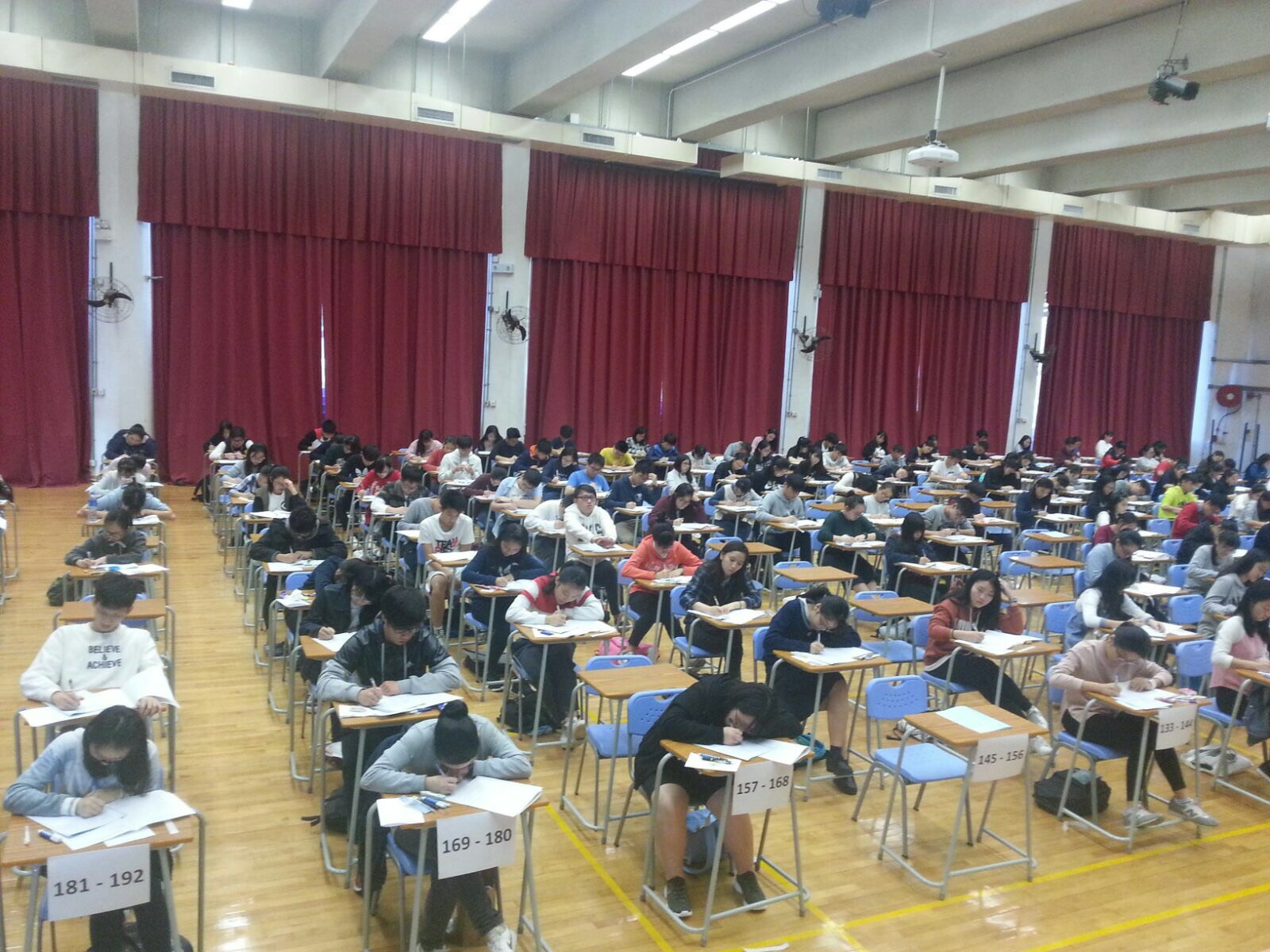 又本年度十二月二日中國歷史科聯校模擬試全港共十二個試場(分別在小西灣、筲箕灣、調景嶺、秀茂坪、九龍灣、何文 田、葵涌、屯門、天水圍、粉嶺、大埔、沙田),本校亦借出禮堂作為試場之一,參與考生接近二千人。