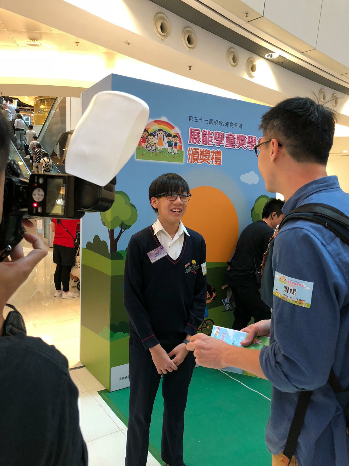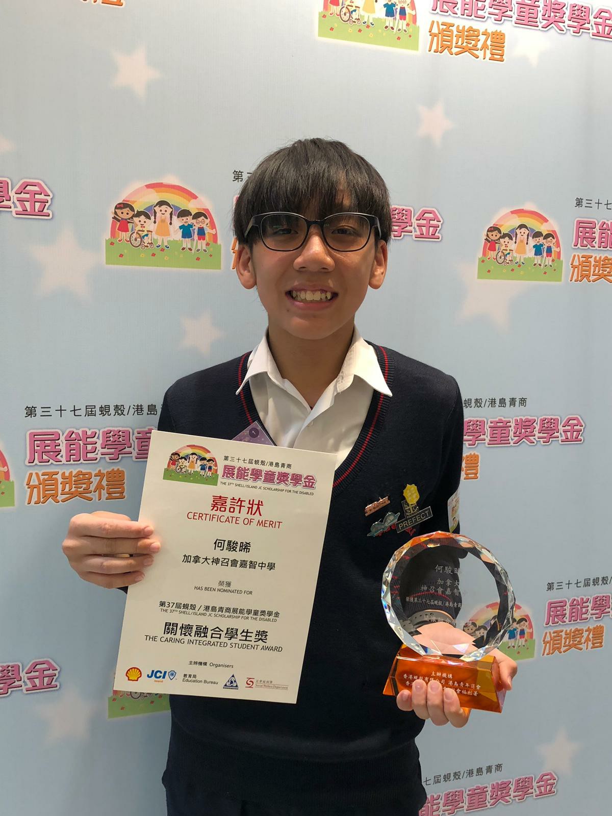 輔導组推薦學生何駿晞參加「蜆殼/港島青商展能學童獎學金」。獎學金的目的是獎勵積極推動校內共融學習的學生,協助有特殊教育需要學生投入校園生活,對推動校內的共融學習有積極作用及表現。得獎學生可得獲獎學金港幣三千元、證書、獎座及精美紀念品乙份。