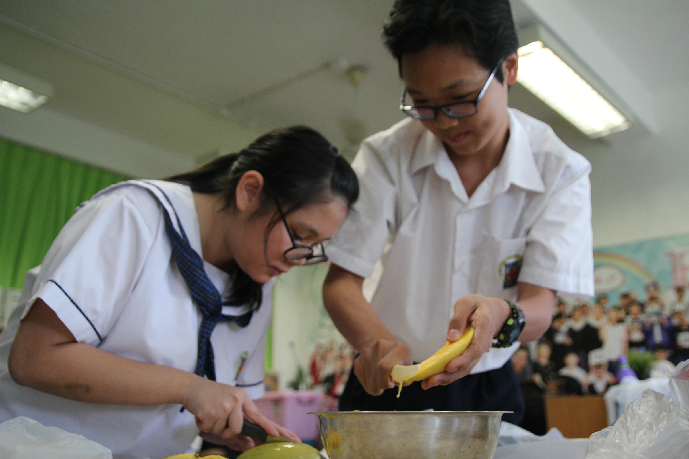 是次午間活動吸引到不少高年級的同學參加,同學們都主動地想要幫忙參與製作,的確, 製作芒果布丁的步驟比前幾次午間活動