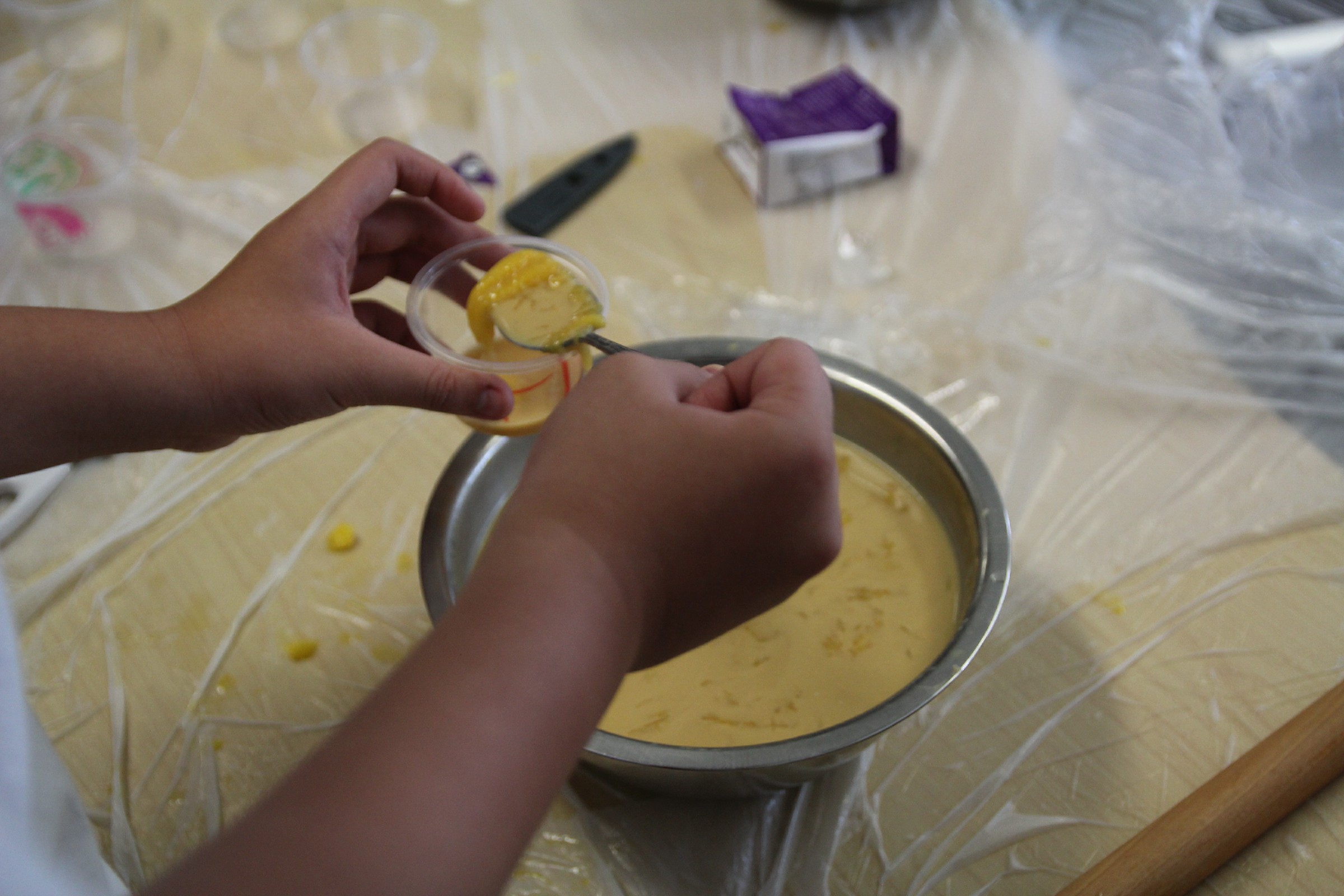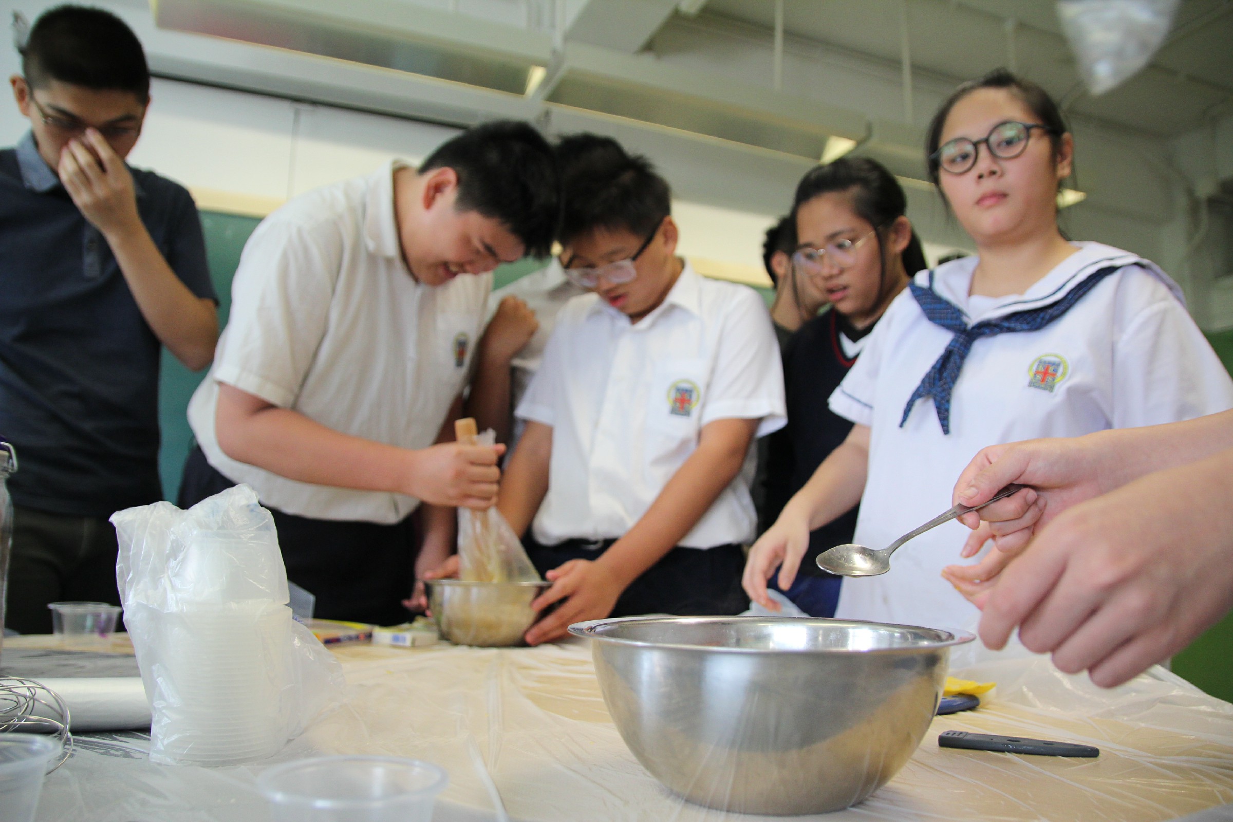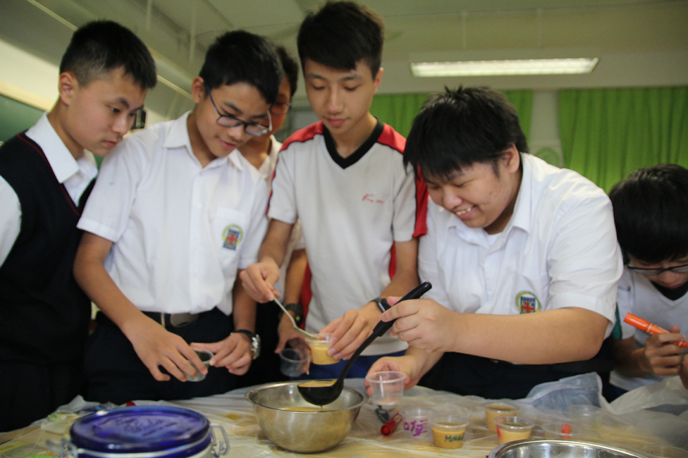 的較多及繁複,同學們需要細心聆聽老師的指示,分工合作,才能夠成功製作出芒果布丁。凝固的過程大約需要2個小時,同學