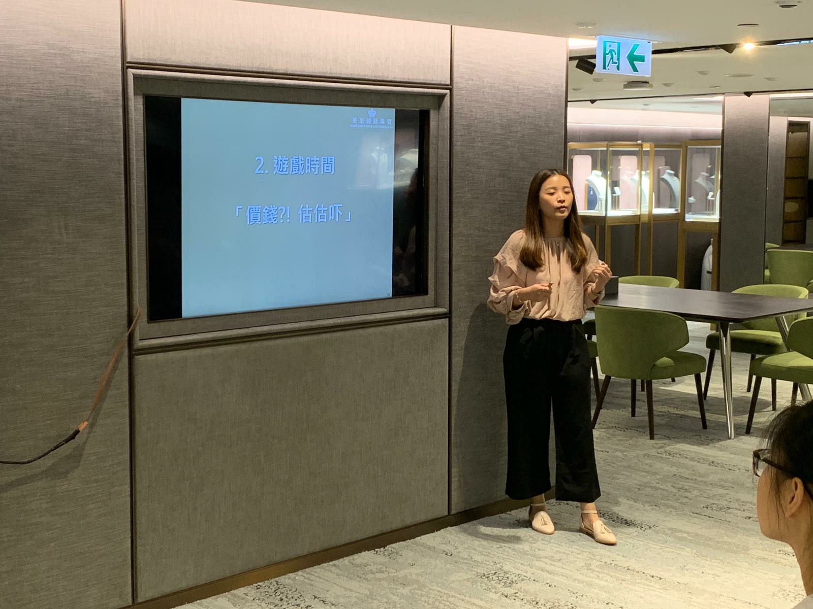 職員為同學介紹英皇集團由經營鐘錶業起家,到英皇集團現時涉獵不同業務,包括娛樂、傳媒、地產、摶彩、慈善等。及後帶領同學參觀店鋪,店內設有金器、翡翠、鑽飾、鐘錶各個展示專區。人事部職員又為同學講述現寶零售業的前景、入職的要求、途徑和晉升機會,希望同學可以積極裝備自己,在未來日子抓緊機遇走出自己的康莊大道