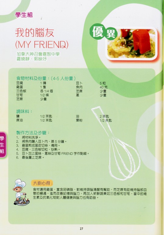 為推動學生積極關懷老年痴呆症(腦退化症)患者,建立關愛共融社會,本校鼓勵學生參與由仁濟醫院主辦的「腦智有營」健腦菜 式設計及烹飪比賽。