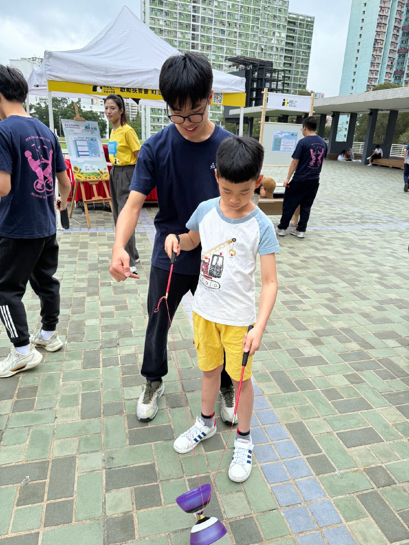 表演結束後,中學生們立刻轉身進入互動教學環節,邀請社區人士參與學習雜耍技巧。居民們熱情響應,分成小組,學習基本的拋接和轉動技巧。同學們耐心指導,分享自己的學習經驗,並鼓勵參加者不斷嘗試。現場氣氛輕鬆愉快,時不時傳來歡聲笑語。