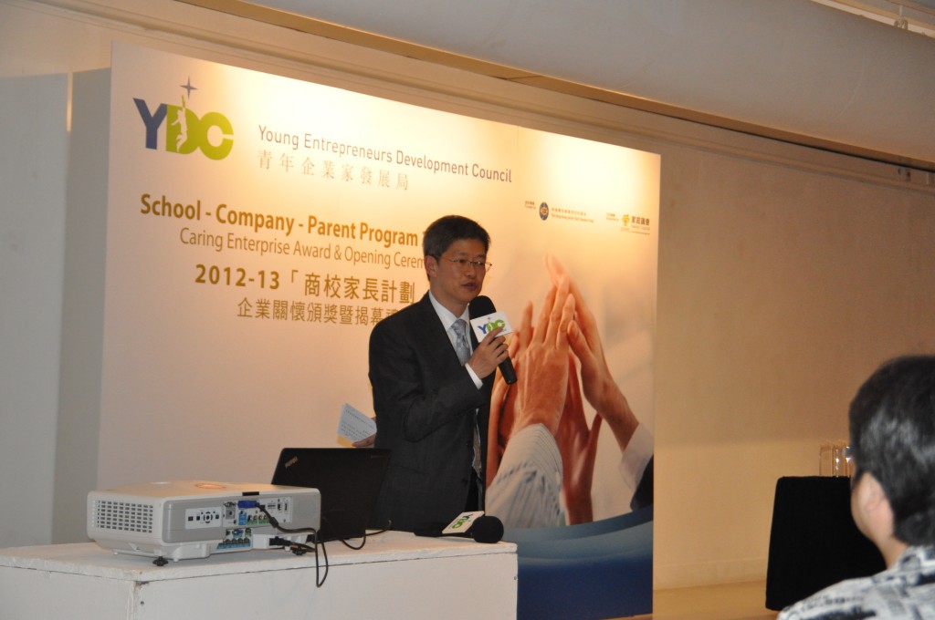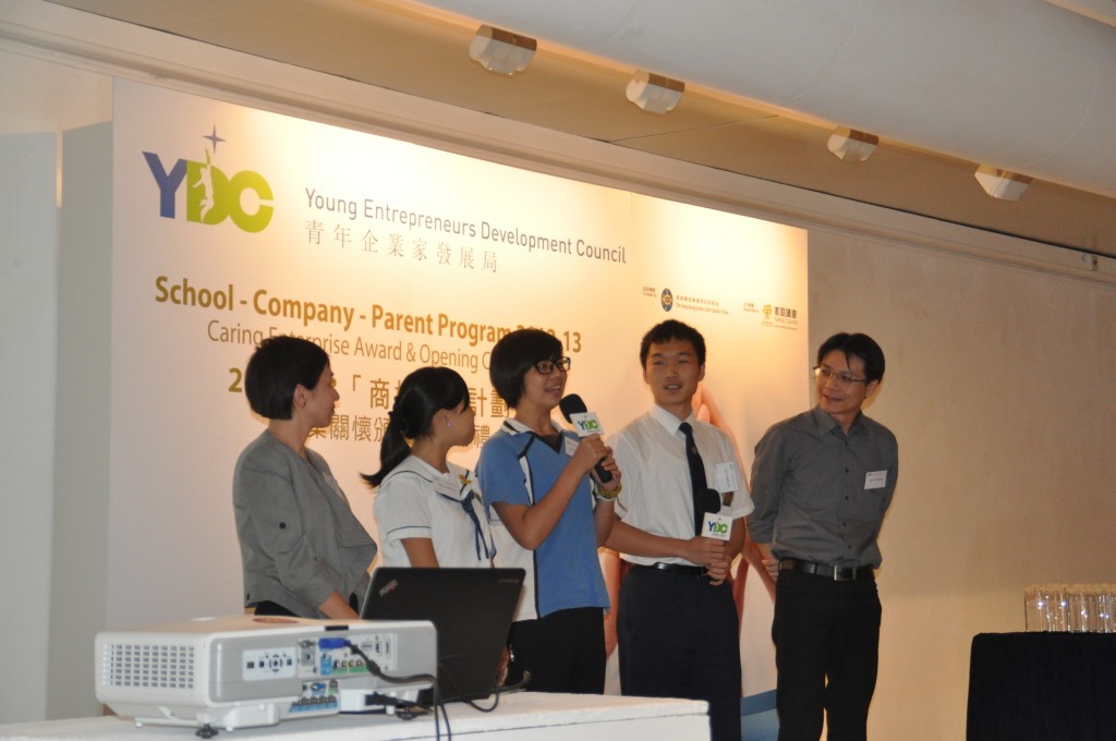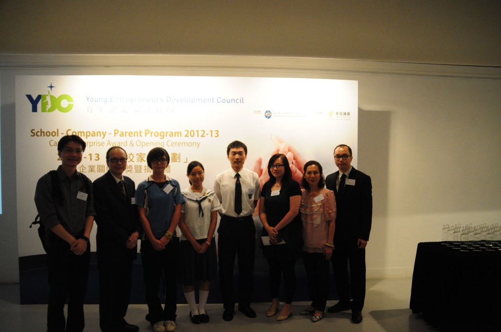 本校參加了本年度青年企業家發展局的「商校家長計劃」,與上海商業銀行結連成合作伙伴。而青年企業家發展局於2012年9月在香港藝中心舉辦「商校家長計劃」企業關懷頒獎禮暨揭幕禮,本校共四位學生和老師獲邀上台分享該計劃及經驗,分別為羅曉婷同學、周廣新同學、張海婷同學及梁偉康老師。當日出席嘉賓包括敎育局局長吳克儉太平紳士、梁劉柔芬女士、家庭議會委員姚子樑先生、賽馬會慈善事務高級經理鄧家鳳女士及數十名公司代表、老師及學生。透過參與這個計劃,讓商界人士進入校園與同學一起互動學習,亦讓同學走出課室,看看商業世界的運作,為自己的未來作好準備。