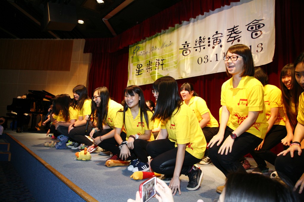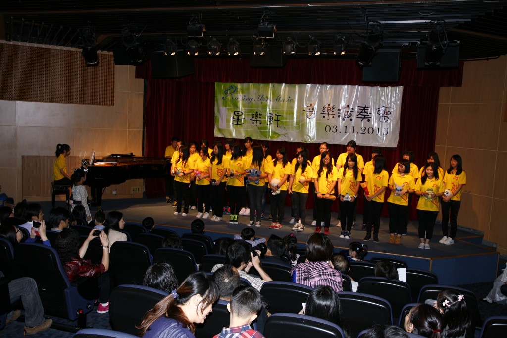 本校合唱團一行三十人應”星樂軒”邀請,參加在香港太空館的學生音樂會。演出當日先由音樂中心的小朋友作鋼琴表演,本校音樂老師為在場觀眾獻唱音樂劇"孤星淚"中的”I Dreamed a dream”,隨後合唱團獻唱”Laudamus Te” 。最後以歌聲和舞蹈帶領小朋友唱頌”Deep Down in my heart”及”時常都快樂”。