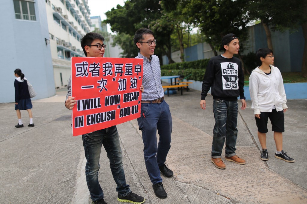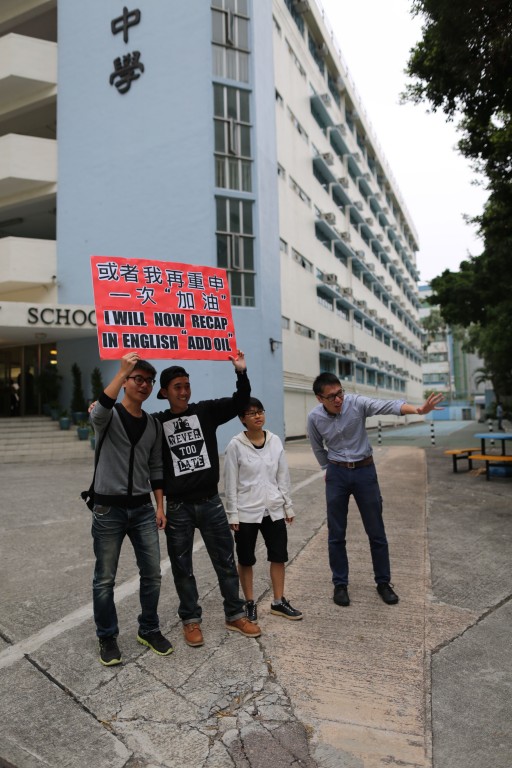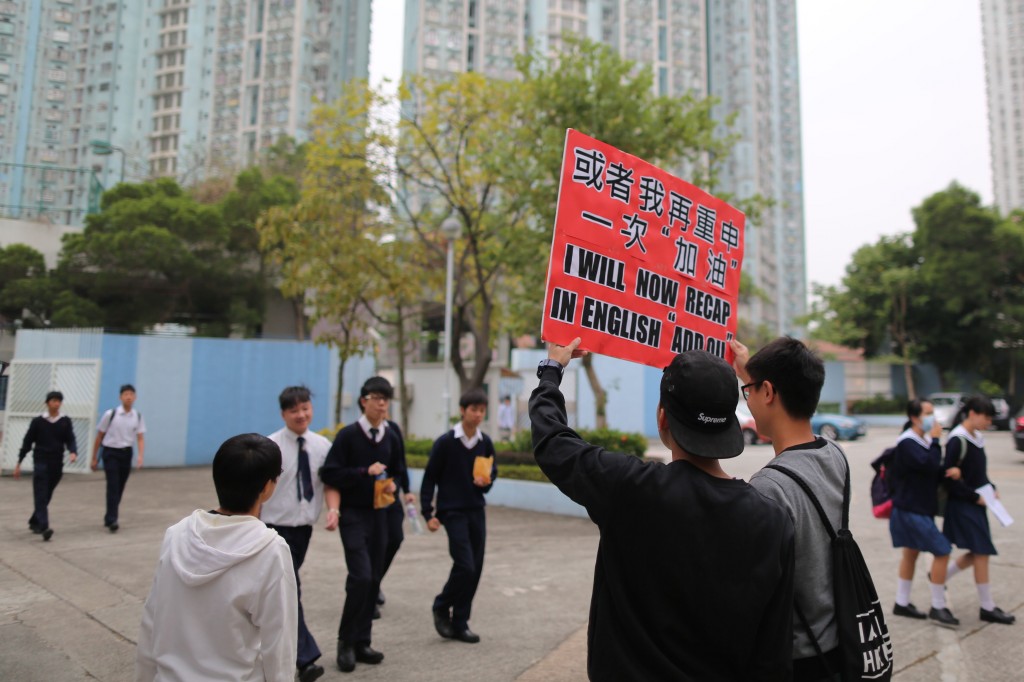 他們別出心裁地高舉「示威牌」,提醒學生「速讀,否則FAIL﹗」另外,他們亦用上近期流行的口號「或者我再重申一次:加油﹗」為學生打氣,讓因應付考試而深感壓力的同學仔送上一份祝福及平安。