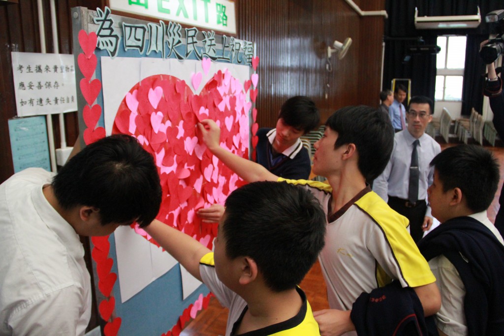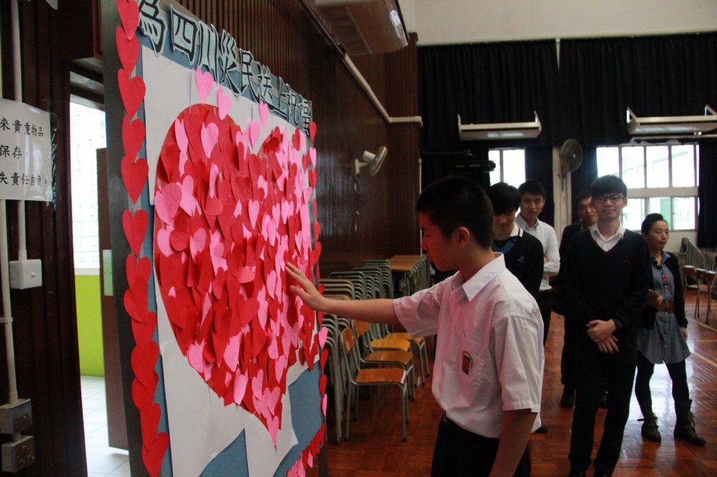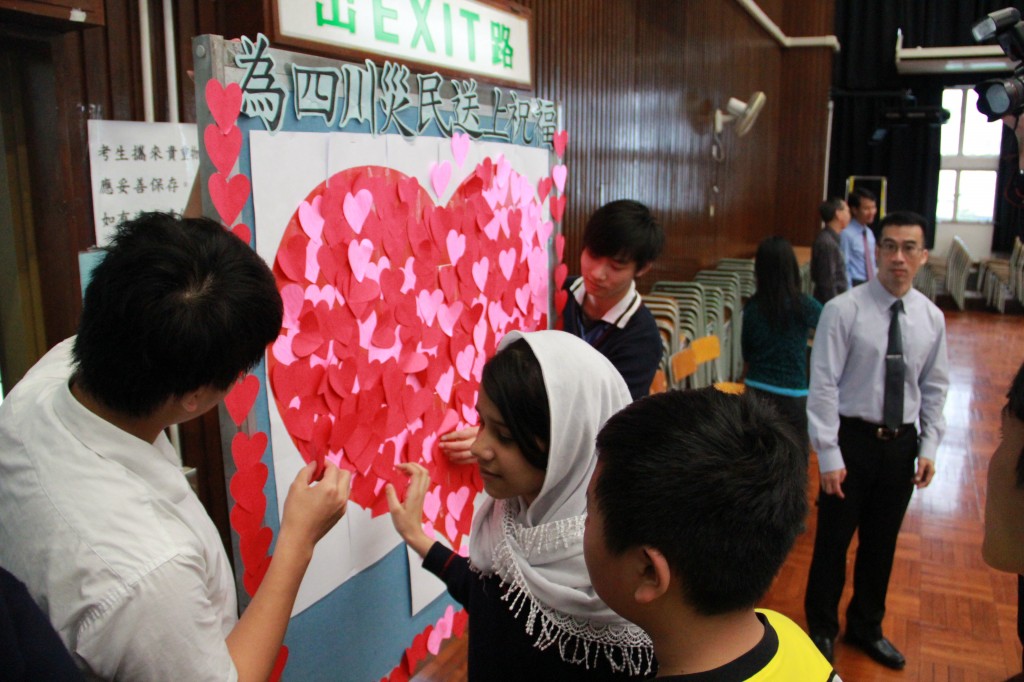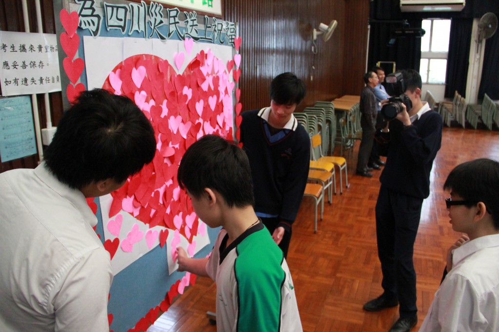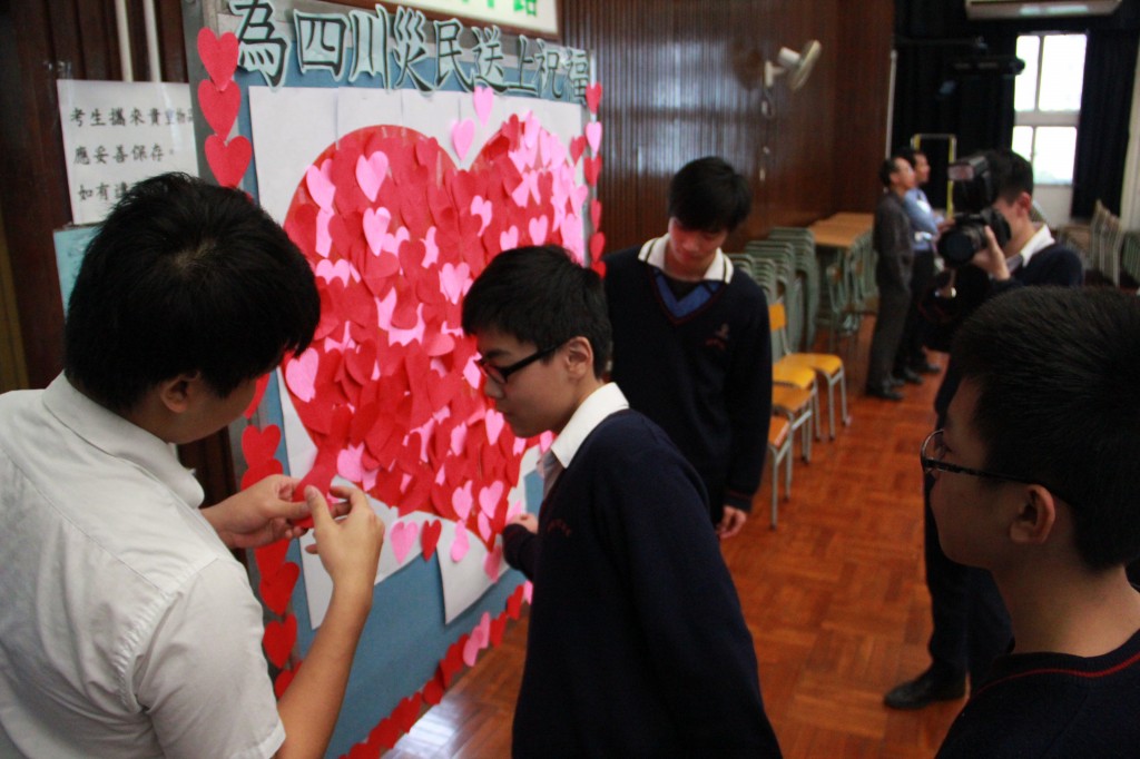 本校先以音樂及影片交代雅安地震事件,接著由老師分享經驗及感受,最後師生將祝福心意咭紙拼貼壁報,齊為遠方的災民送上祝福及打氣。