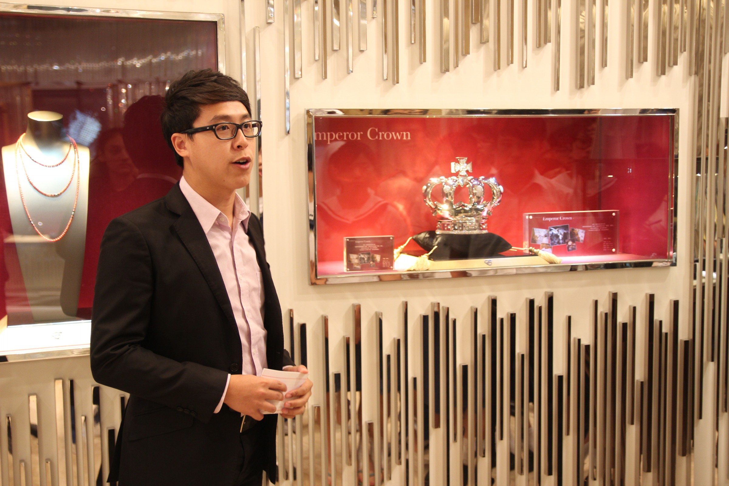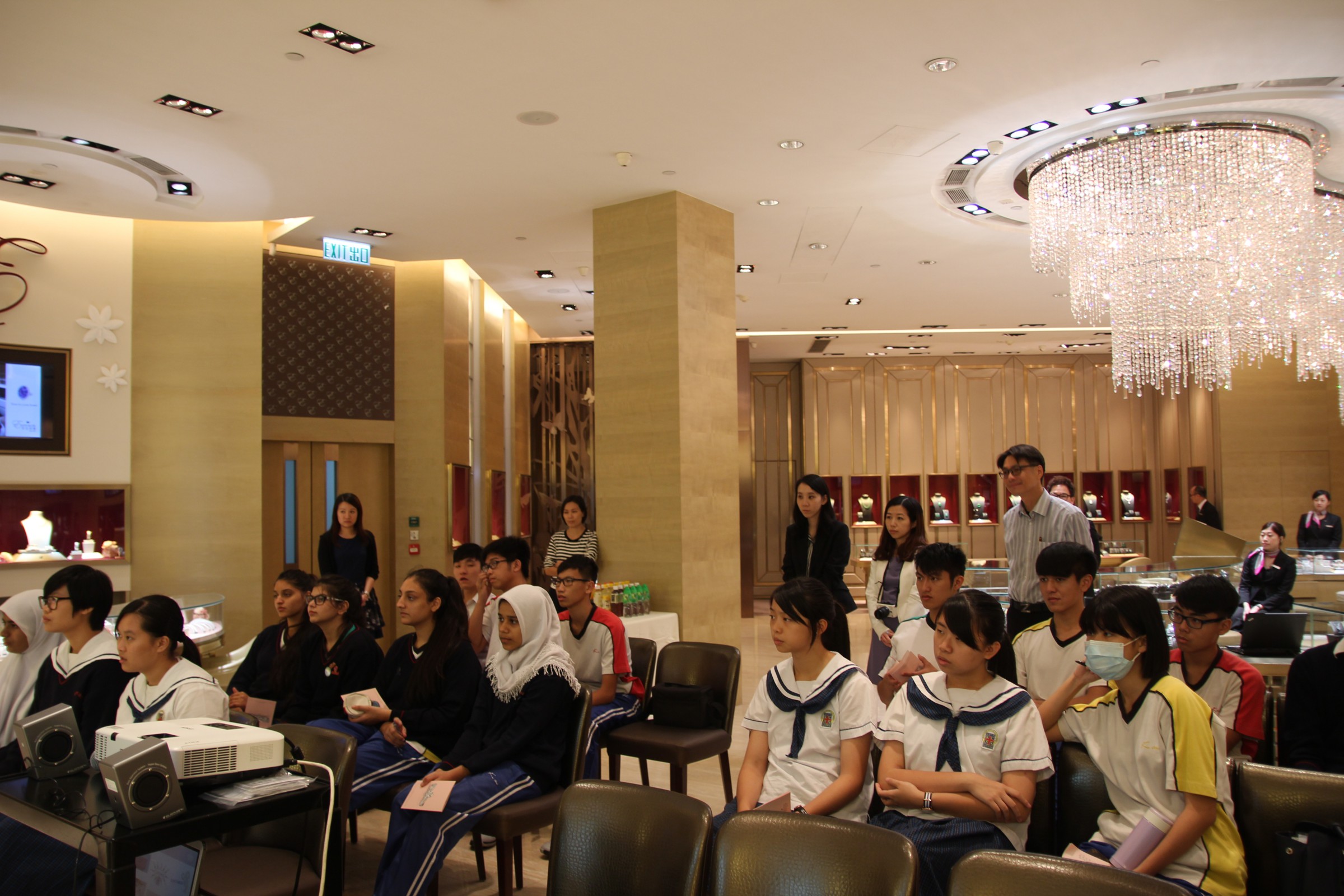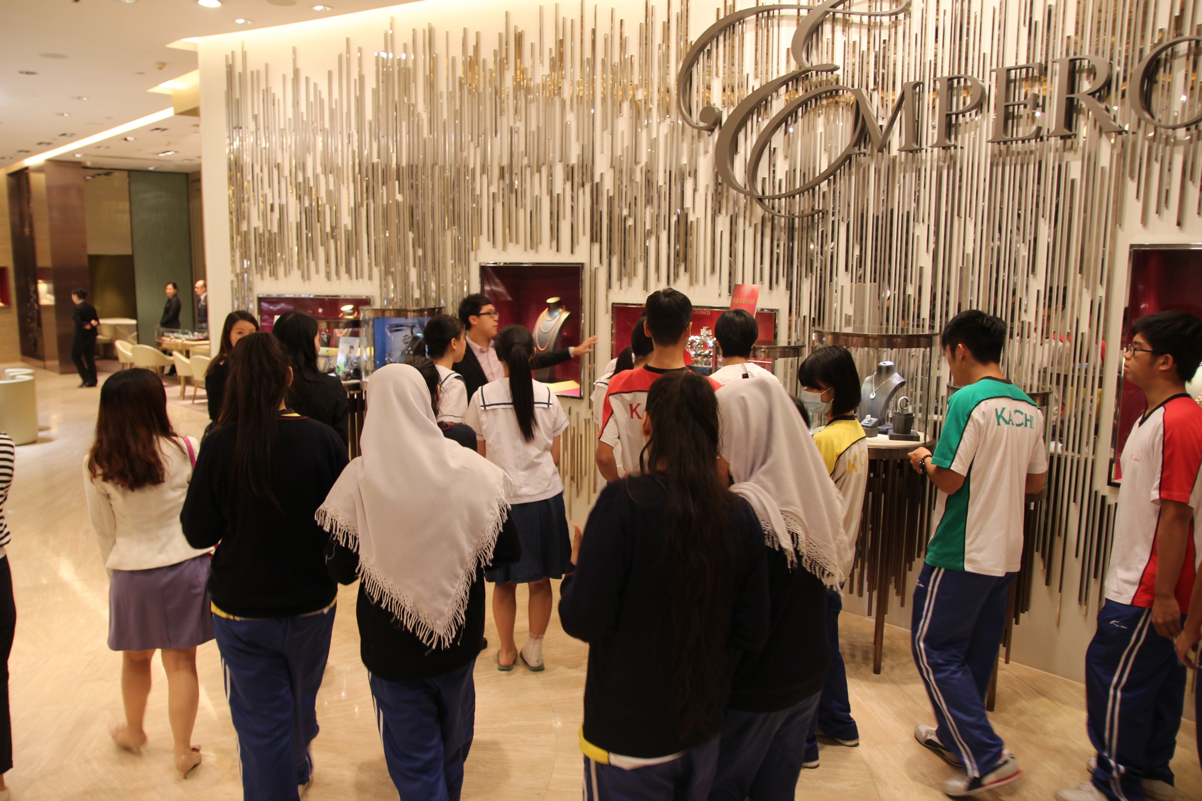 由英皇珠寶市場部職員為同學介紹英皇集團由經營鐘錶業起家,到英皇集團現時涉獵不同業務,包括娛樂、傳媒、地產、摶彩等。及後帶領同學參觀店鋪,店內設有金器、翡翠、鑽飾的各個珠寶展示專區。最後由人事部職員為同學講述現時鐘錶珠寶零售業的前景、入職的要求、途徑和晉升機會,希望同學可以積極裝備自己,在未來日子抓緊機遇走出自己的康莊大道。