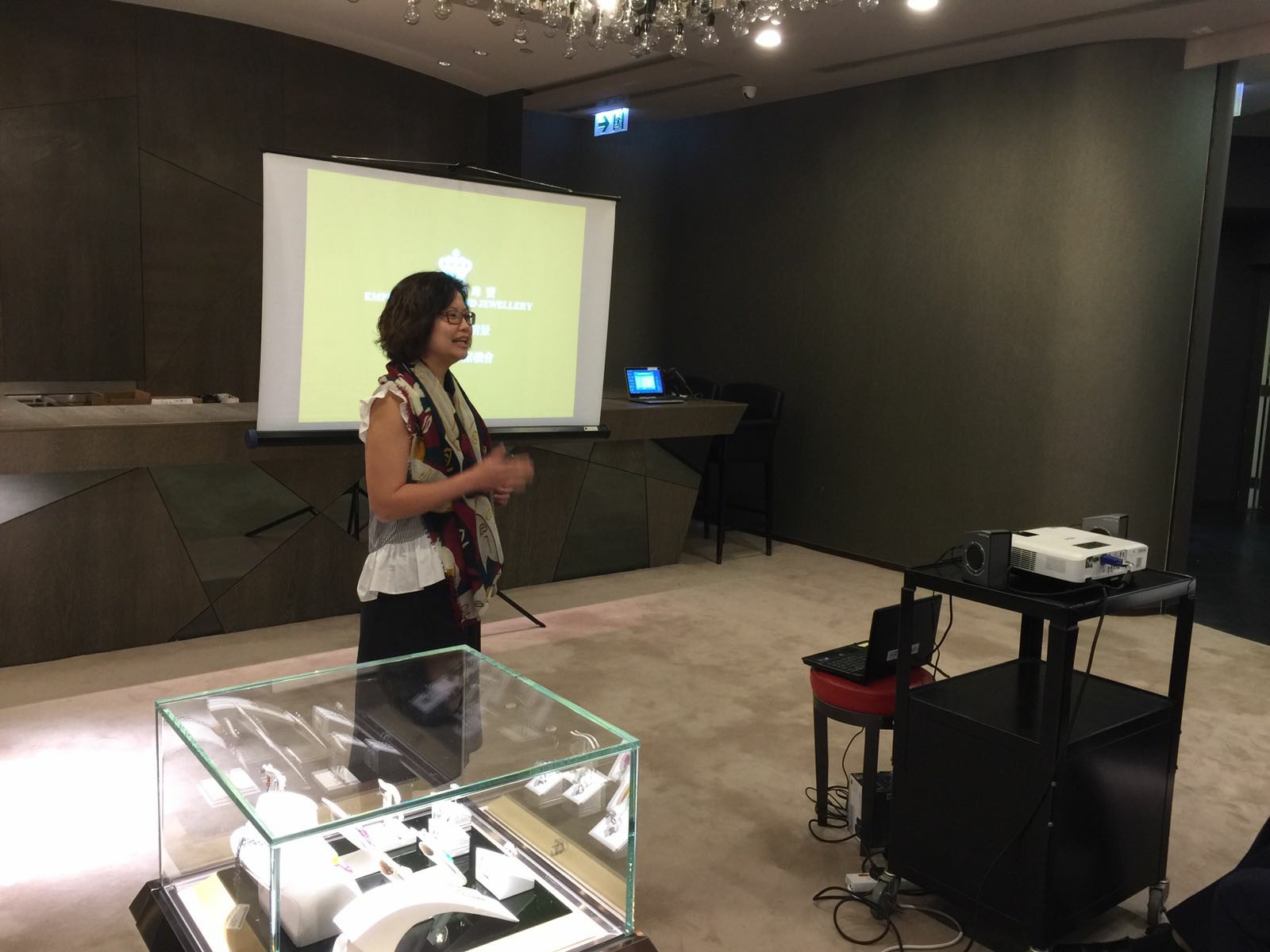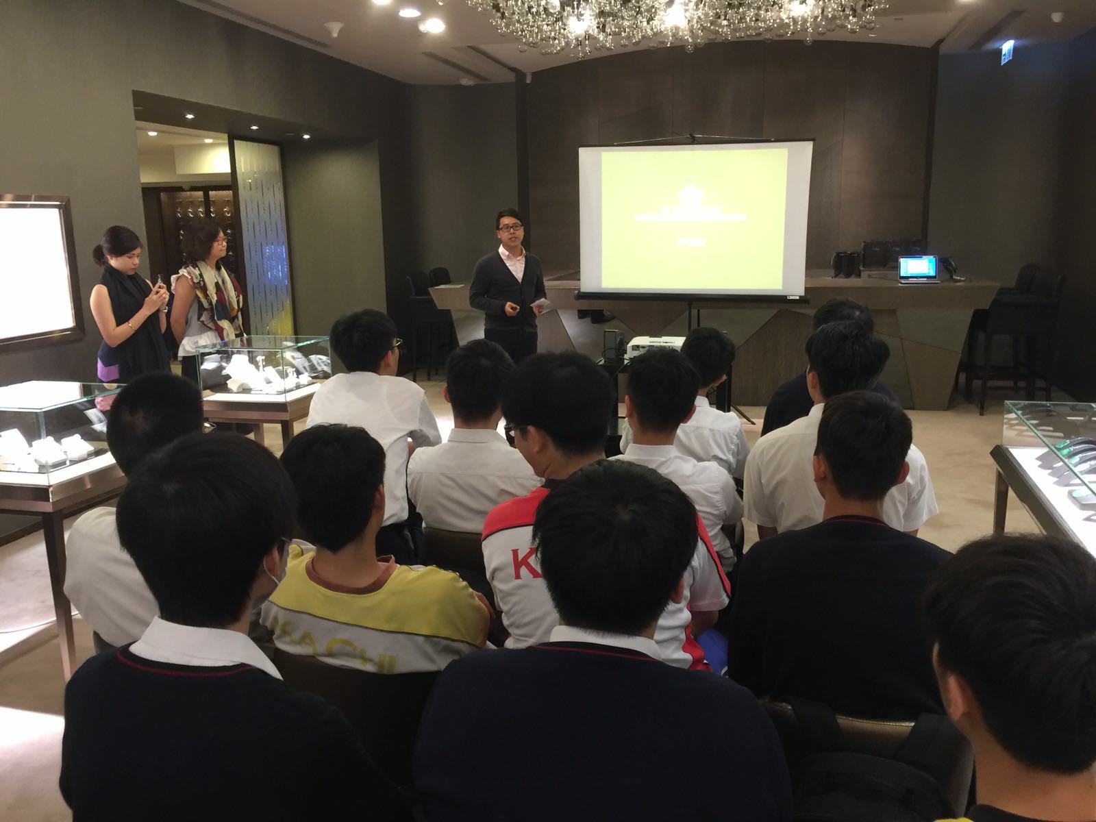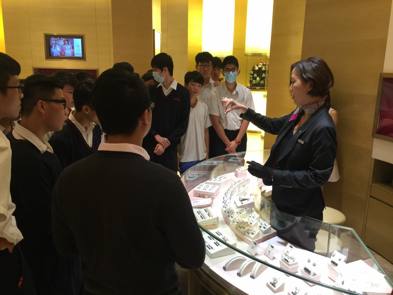 首先安排簡單的講座,為同學介紹英皇集團涉及不同業務,包括娛樂、傳媒、地產、摶彩和珠寶等。及後帶領同學參觀店鋪,店內設有金器、翡翠、鑽飾的各個專門展示區。最後人事部職員講解鐘錶珠寶零售業的前景、入職要求和晉升機會等,希望同學可以積極裝備自己,在未來日子抓緊機遇,走出自己的康莊大道。