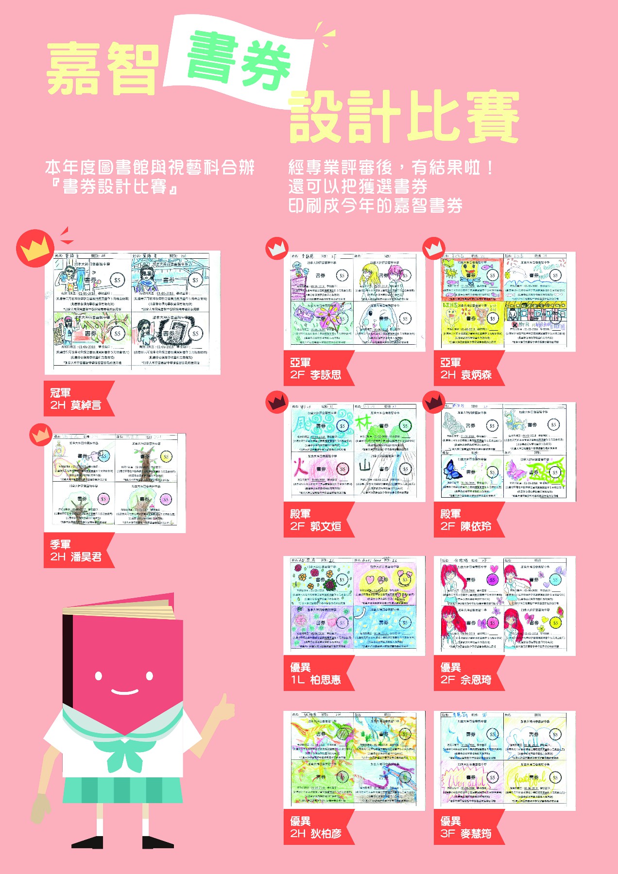 圖書館每年都會印製書券給各科老師,奬勵同學在學科及閱讀上的優良成績,今年九月圖書館與視藝科再度合作舉行了嘉智書券設計比賽,同學都花盡心思設計,經專業評審後,有結果啦!圖書館特別頒發獎狀鼓勵以上得獎同學。