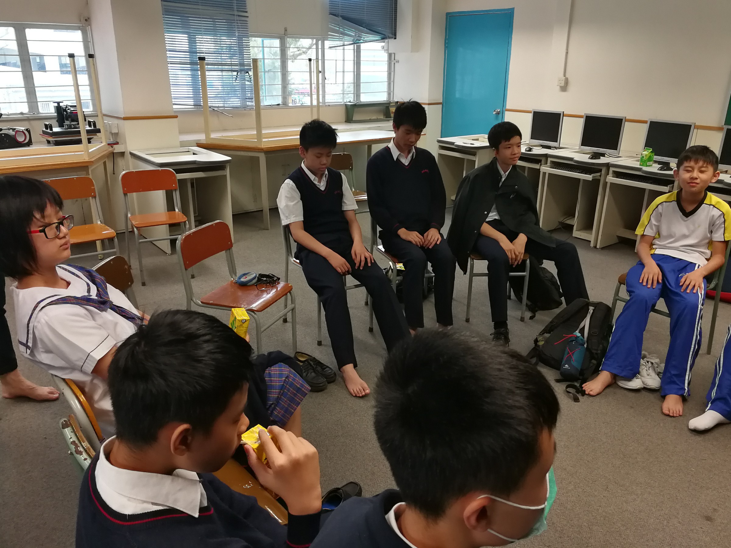 好心情大使的小組訓練已進入第三節,除了互動的遊戲訓練,這次也加入了靜觀(Mindfulness)訓練。透過靜觀練習,同學能更清晰及全面地觀察自己的身體、思想、 情緒及行為的狀態。從同學們專注和認真的表情可見,他們也十分享受「靜觀」的過程,也能夠從中更了解自己的狀態。