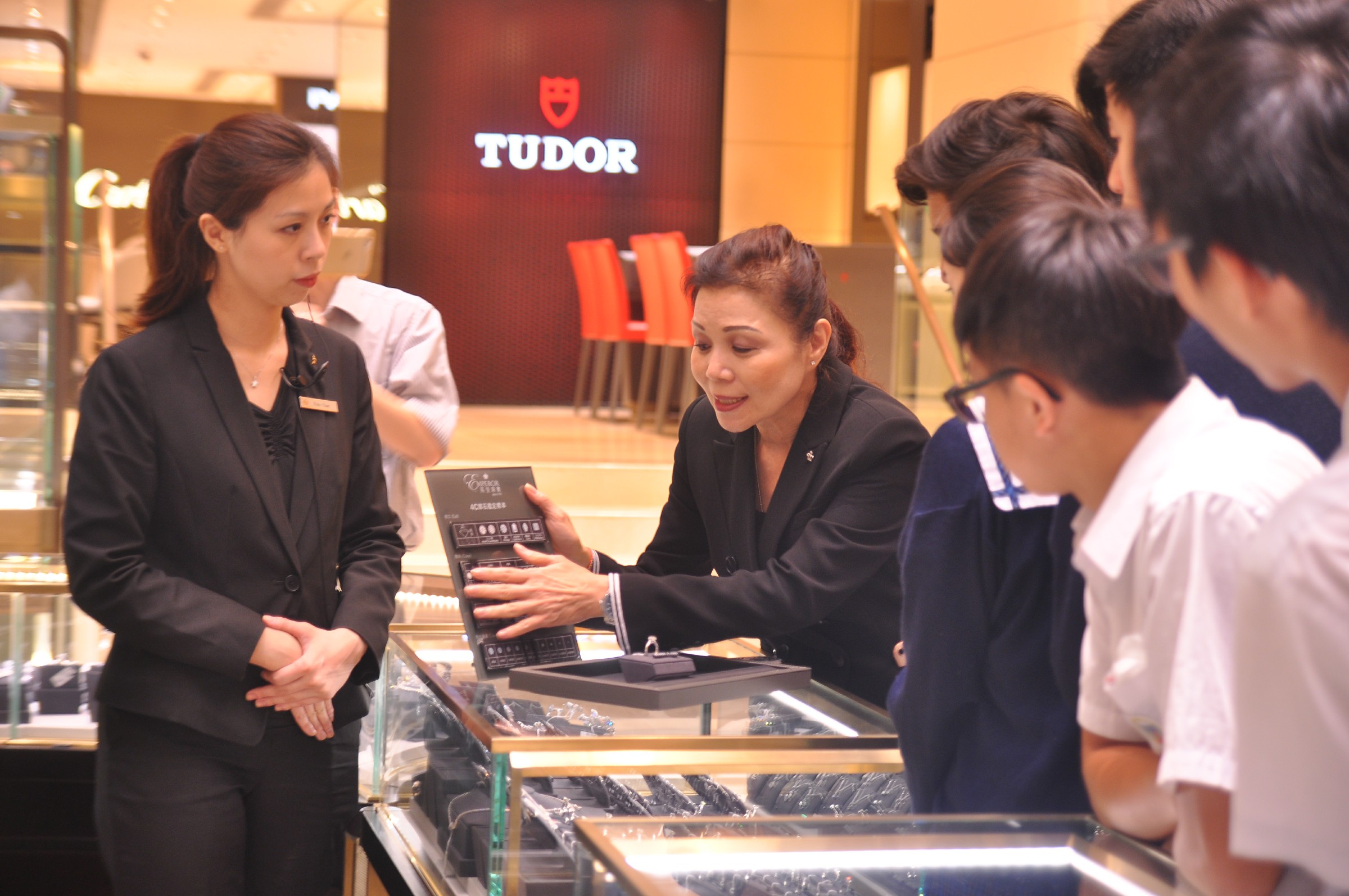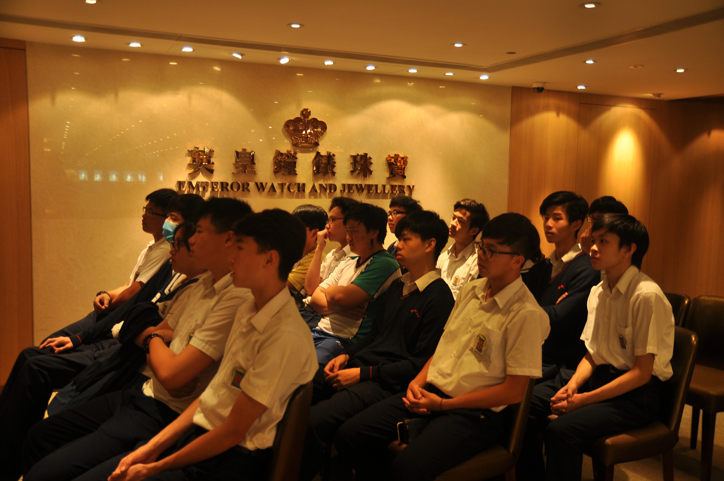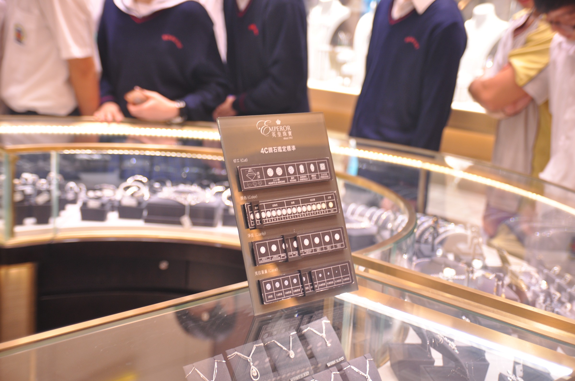 由英皇珠寶市場部職員為同學介紹英皇集團由經營鐘錶業起家,到英皇集團現時涉獵不同業務,包括娛樂、傳媒、地產、摶彩等。及後帶領同學參觀店鋪,店內設有金器、翡翠、鑽飾的各個珠寶展示專區。最後由人事部職員為同學講述現時鐘錶珠寶零售業的前景、入職的要求、途徑和晉升機會,希望同學可以積極裝備自己,在未來日子抓緊機遇走出自己的康莊大道。