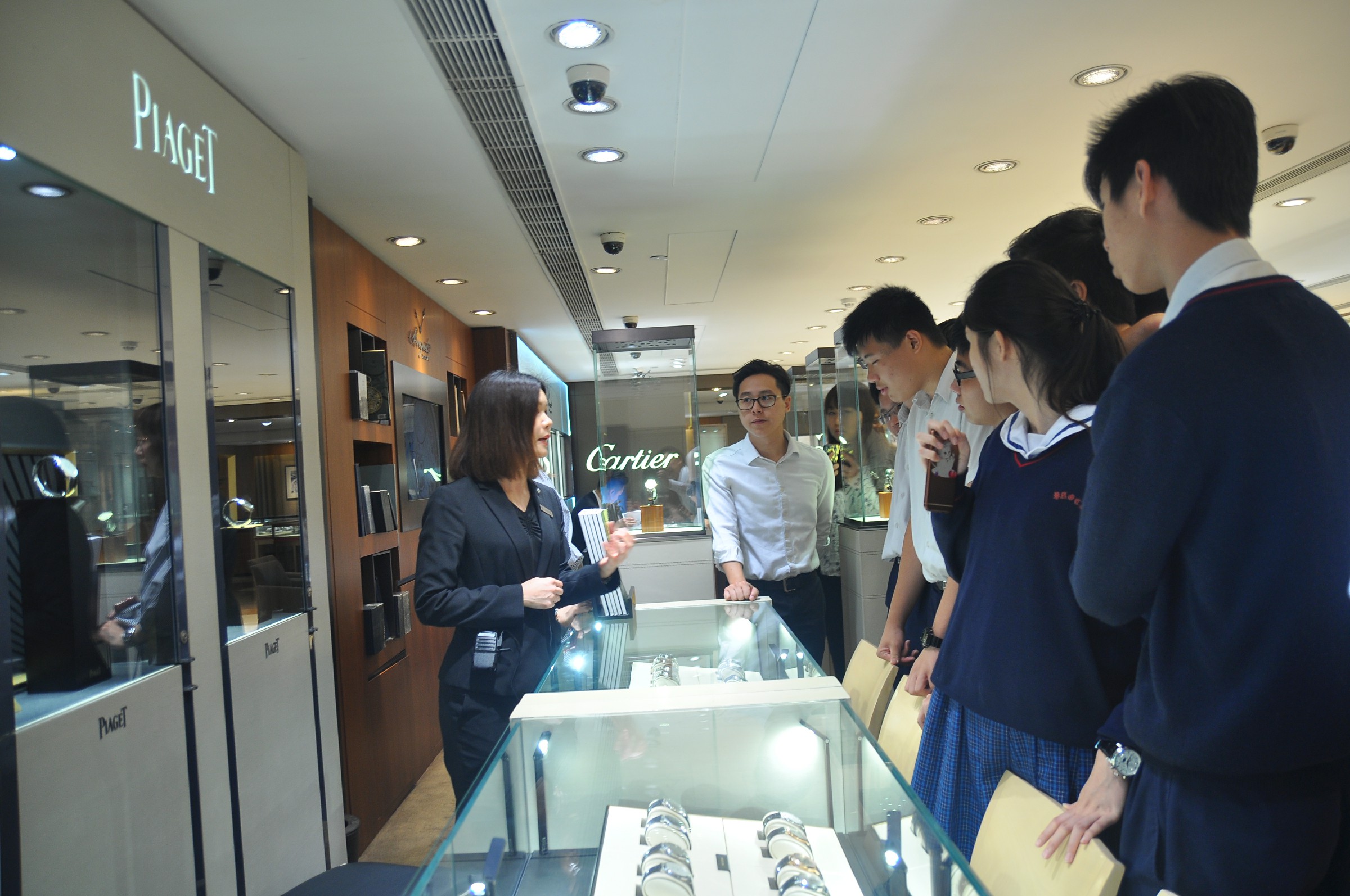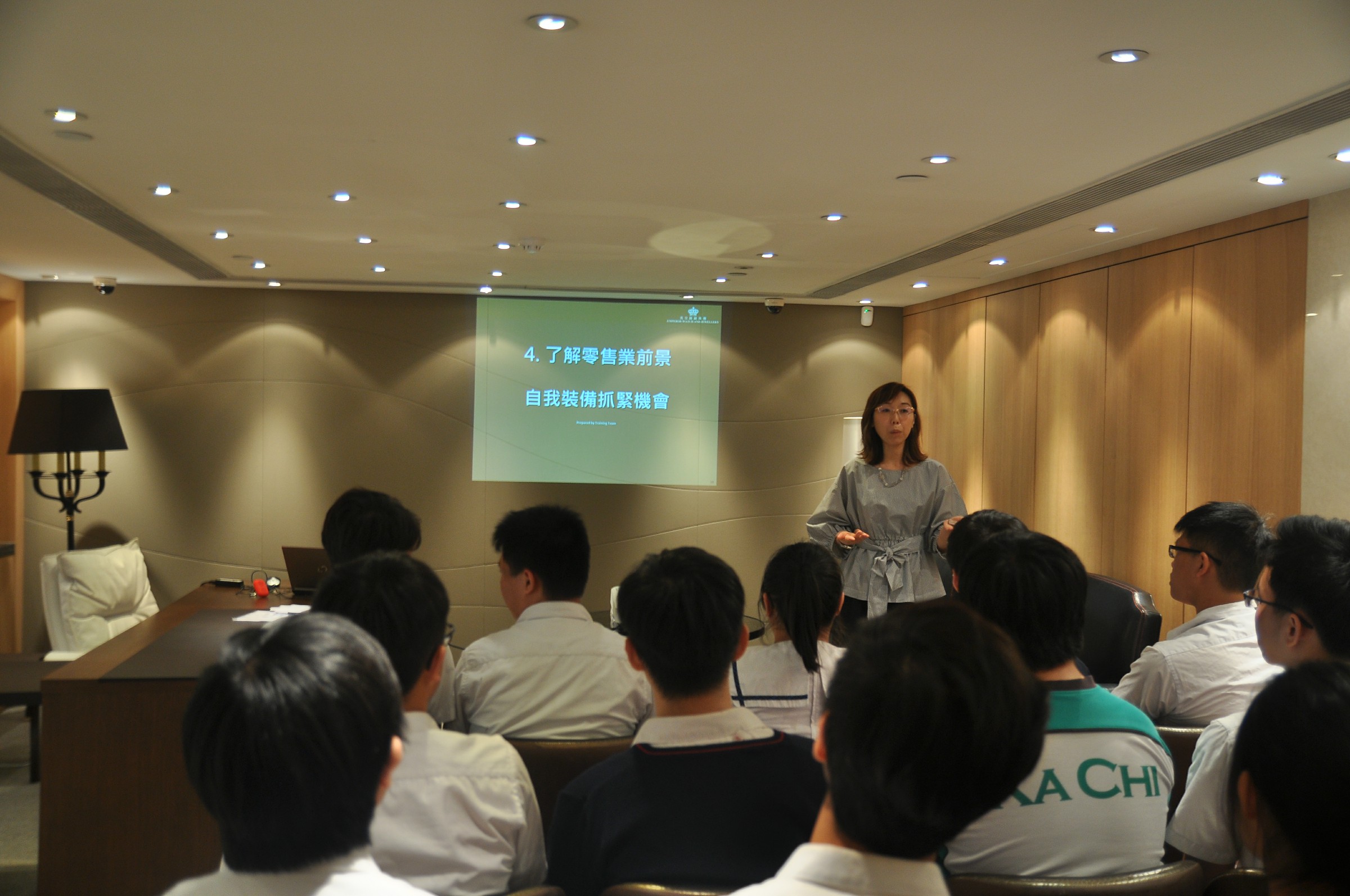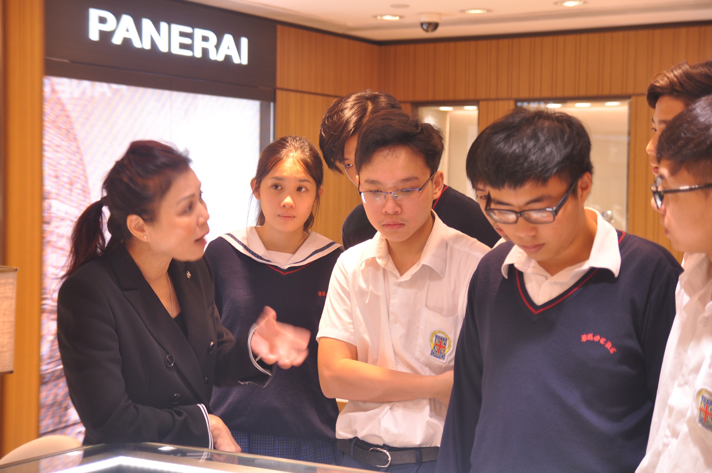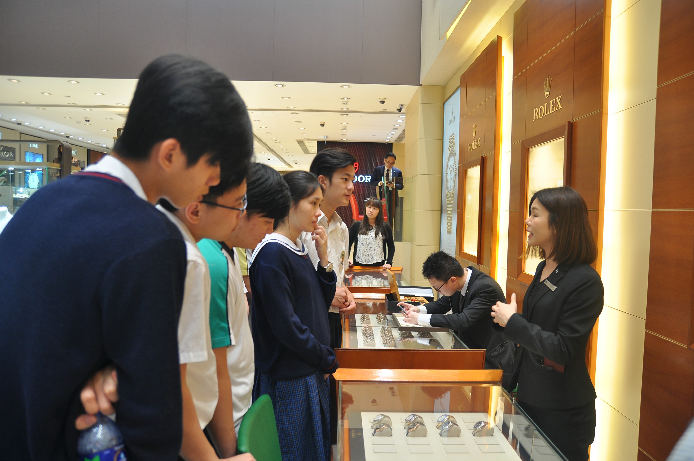 由英皇珠寶市場部職員為同學介紹英皇集團由經營鐘錶業起家,到英皇集團現時涉獵不同業務,包括娛樂、傳媒、地產、摶彩等。及後帶領同學參觀店鋪,店內設有金器、翡翠、鑽飾的各個珠寶展示專區。最後由人事部職員為同學講述現時鐘錶珠寶零售業的前景、入職的要求、途徑和晉升機會,希望同學可以積極裝備自己,在未來日子抓緊機遇走出自己的康莊大道。