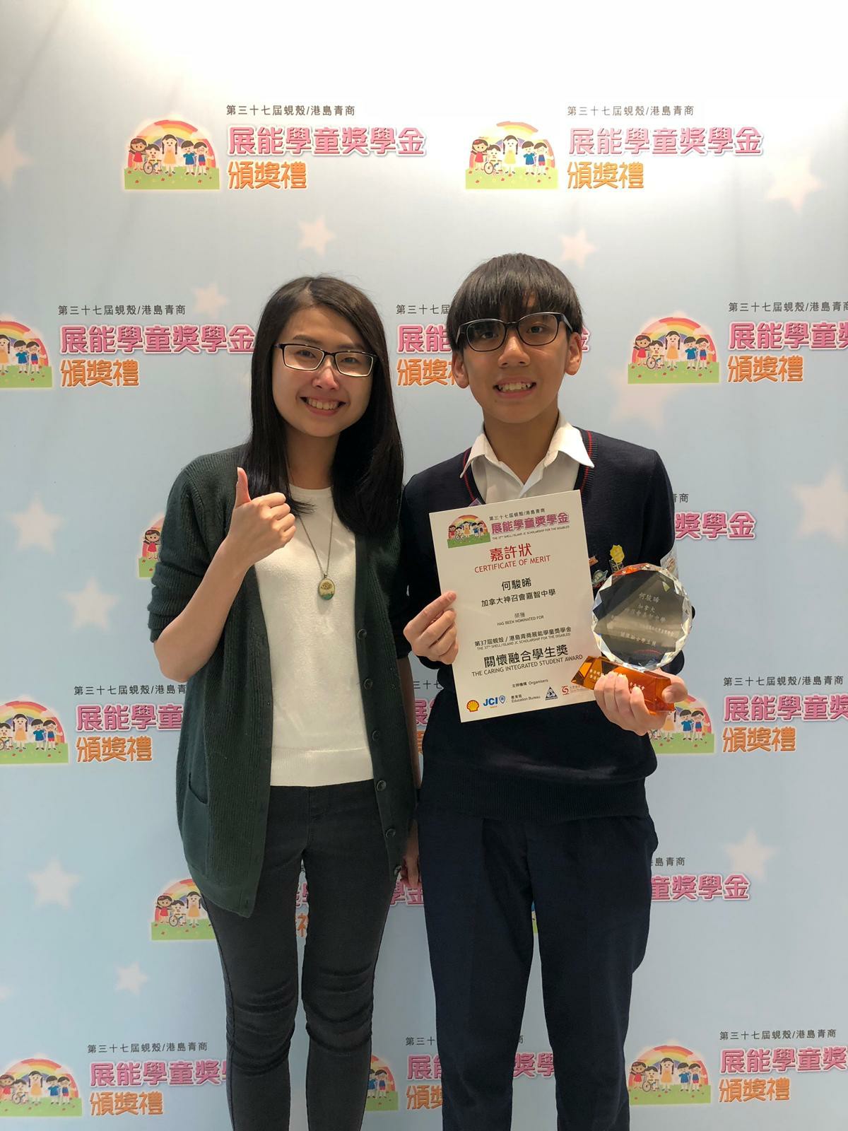 輔導组推薦學生何駿晞參加「蜆殼/港島青商展能學童獎學金」。獎學金的目的是獎勵積極推動校內共融學習的學生,協助有特殊教育需要學生投入校園生活,對推動校內的共融學習有積極作用及表現。得獎學生可得獲獎學金港幣三千元、證書、獎座及精美紀念品乙份。