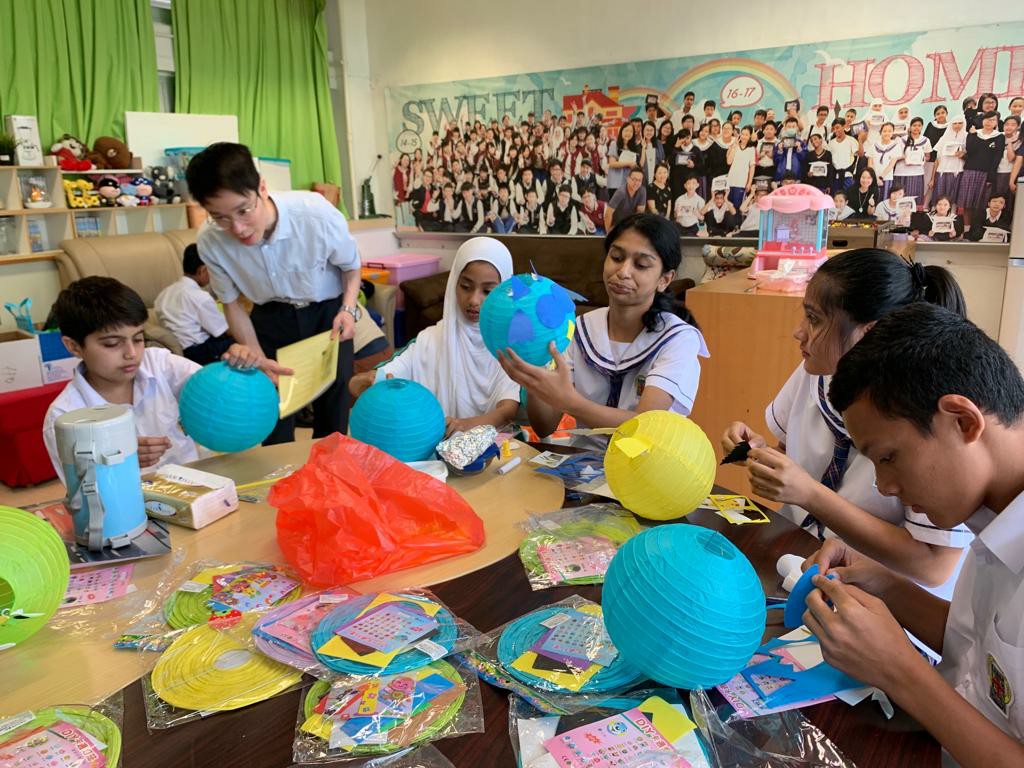 學生支援組和輔導組的老師為了讓非華語同學認識中國傳統節日——中秋節,於中秋節前一天,約了他們一起講中秋節的故事和製作花燈。每個同學都親手製作自己的花燈,各有特色。當他們手持花燈時,七彩繽紛,為學校添上不少中秋節氣氛。