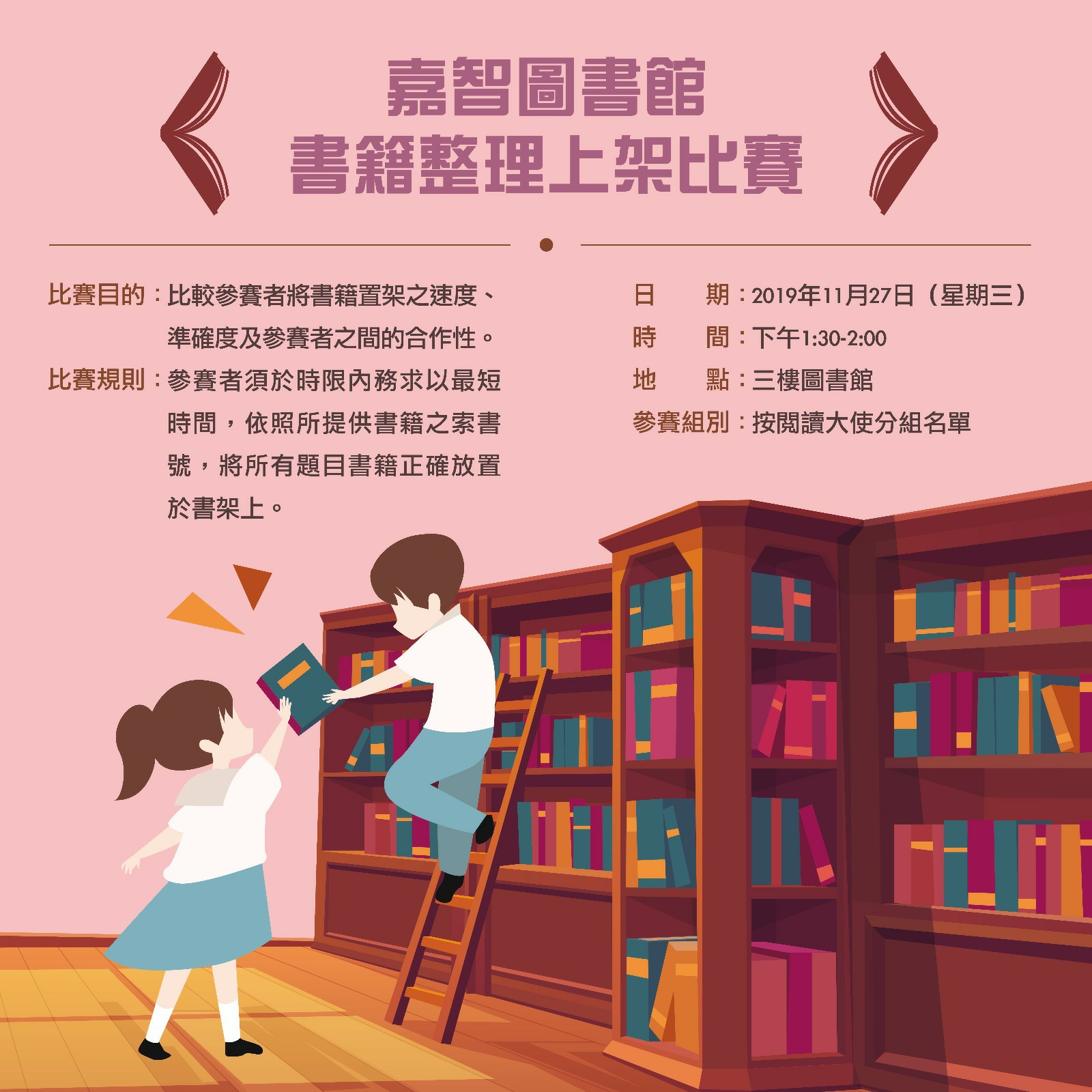 嘉智圖書館於十一月廿七日舉行「書籍整理上架比賽」,參賽者須於時限內以最短時間將題目內的書籍,