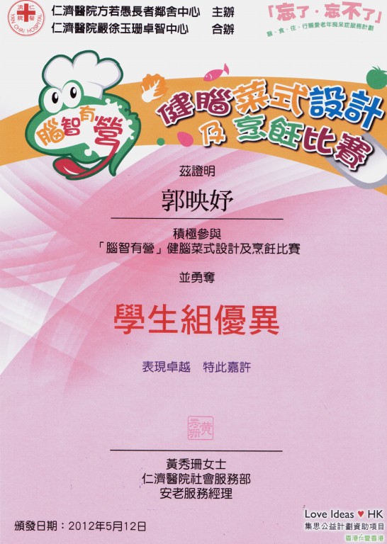 為推動學生積極關懷老年痴呆症(腦退化症)患者,建立關愛共融社會,本校鼓勵學生參與由仁濟醫院主辦的「腦智有營」健腦菜 式設計及烹飪比賽。
