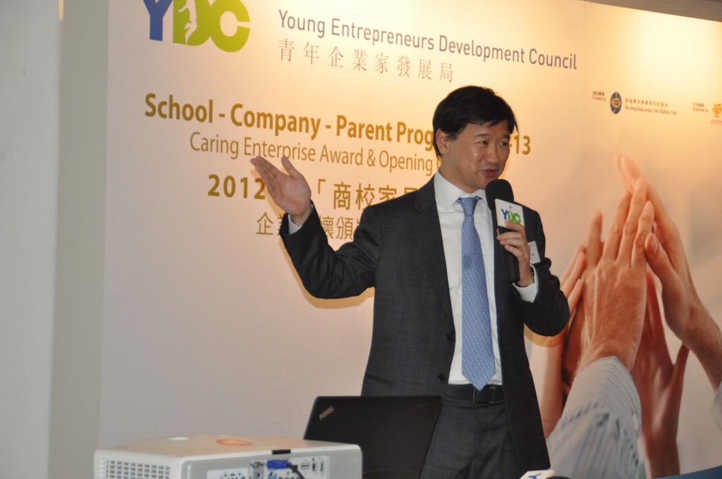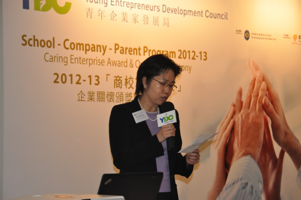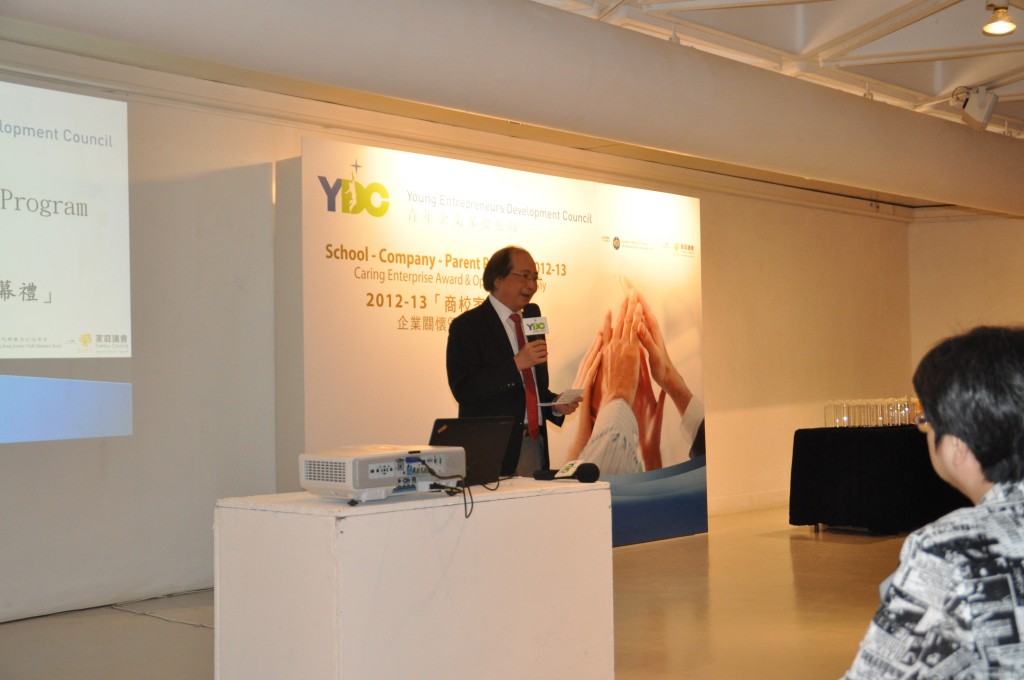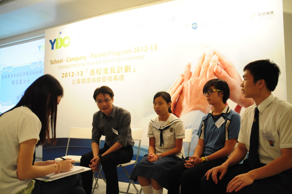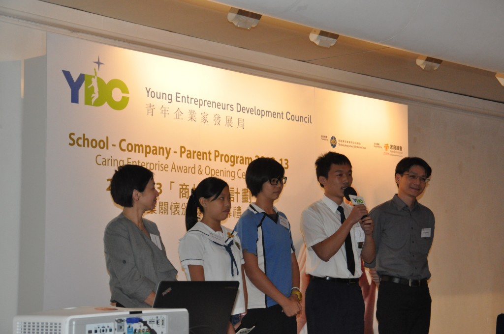 本校參加了本年度青年企業家發展局的「商校家長計劃」,與上海商業銀行結連成合作伙伴。而青年企業家發展局於2012年9月在香港藝中心舉辦「商校家長計劃」企業關懷頒獎禮暨揭幕禮,本校共四位學生和老師獲邀上台分享該計劃及經驗,分別為羅曉婷同學、周廣新同學、張海婷同學及梁偉康老師。當日出席嘉賓包括敎育局局長吳克儉太平紳士、梁劉柔芬女士、家庭議會委員姚子樑先生、賽馬會慈善事務高級經理鄧家鳳女士及數十名公司代表、老師及學生。透過參與這個計劃,讓商界人士進入校園與同學一起互動學習,亦讓同學走出課室,看看商業世界的運作,為自己的未來作好準備。