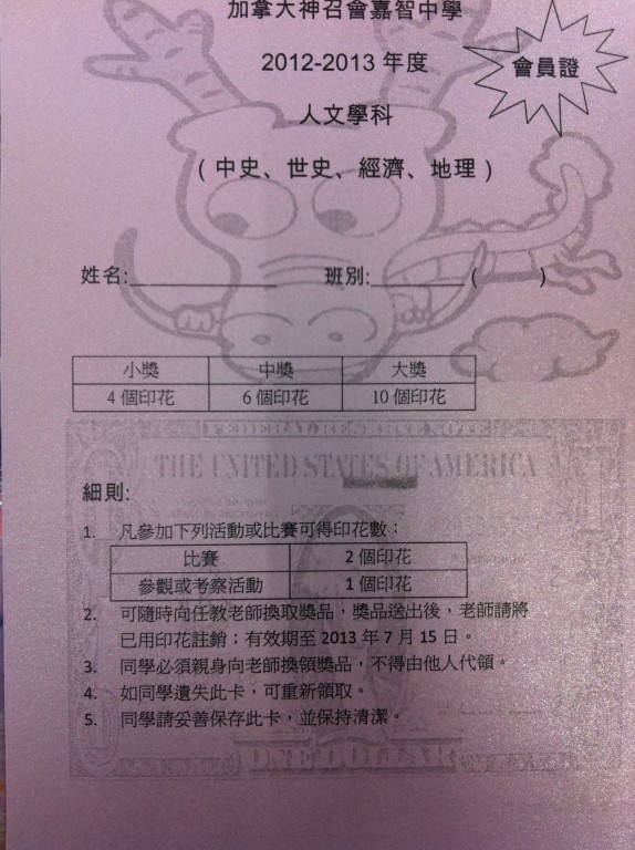 配合今年人文領域學科, 為了鼓勵同學多參與學習活動, 提高學習興趣, ,我們設計了一張精美的會員證, 推行獎勵計劃。凡同學參加活動便可取得印花一個; 連同上次國民教育中心「中華歷史長河」及今次參觀展覽活動及比賽, 每位中一同學應已集齊4個, 換取細獎。