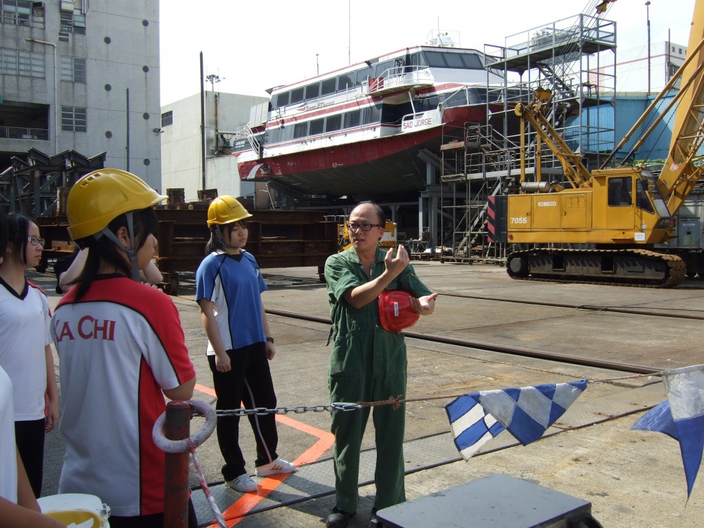 「商校家長合作計劃」在5月24日進行第3次工作坊,由信德集團公司大使安排參觀荔枝角噴射飛航船務公司及船廠活動。當日24位同學由培訓部主管朱先生、,船長林先生和工程部主管劉先生帶領講解,先介紹兩千多人的公司架構、營運及各類船隻,再詳細解釋客運服務及管理船隊等後勤支援,其中最精彩的環節便是親身接觸正在維修價值過億元的噴射水翼船及超過100萬美元的發動機,又教導同學試穿救生衣,及後招待我們在職員食堂享用自助下午茶,當中更安排3位剛在幾年前中學畢業的年青員工,講述如何入職及晉升前景,強調大約以8年時間可透過進修,便可獲取船長資格,其中2名年青職員更是女性,令同學對航運業及船隻維修工程加深了解,又打破一般人對航運業的誤解,原來有不少女性船員及固定工作時間,不用輪班工作等等,讓學生了解多一個行業,將來可多一個選擇。