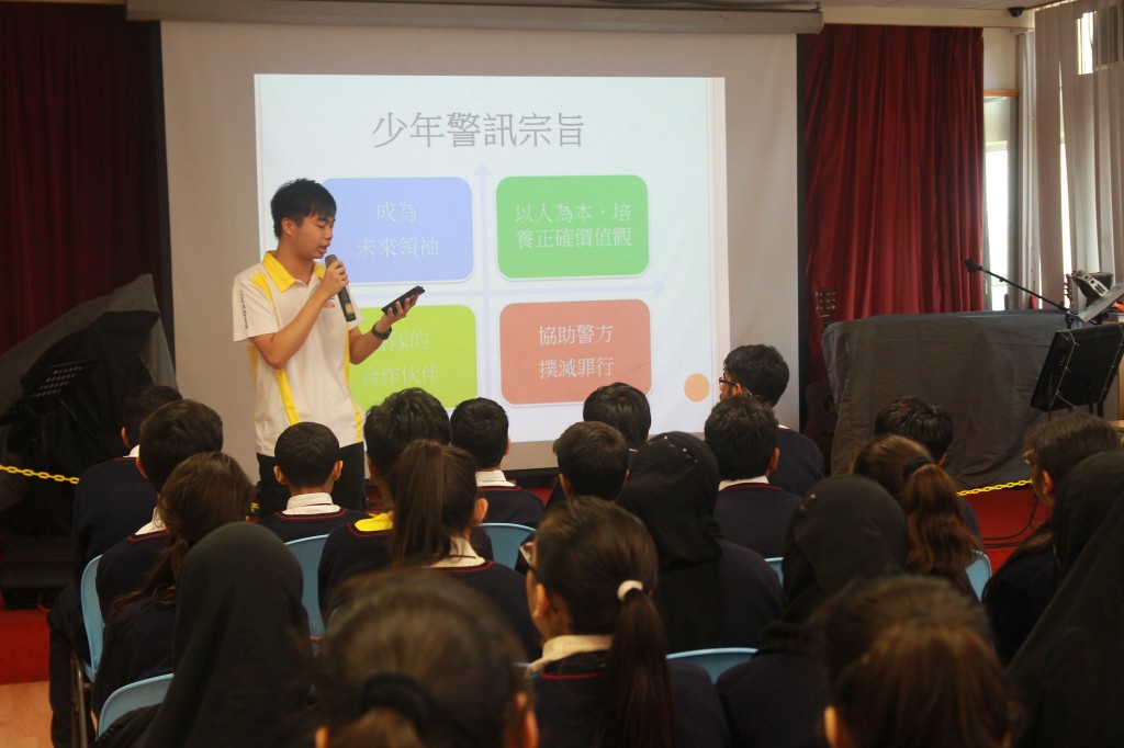 本校有幸於一月二十七日邀請到少年警訊的助理警民主任李兆良先生,警長林美紅女士以及四位負責人蒞臨本校舉辦少年警訊講座,加強學生對香港警方的溝通和認識。是次講座對象為中一至中三非華語學生,內容包括警隊知識、領導才能、管理技巧和個人發展。是次活動除了鼓勵同學成為少年警訊會員外,還希望令同學了解警民合作的重要性,加強對社會的責任感,建立正確的價值觀。