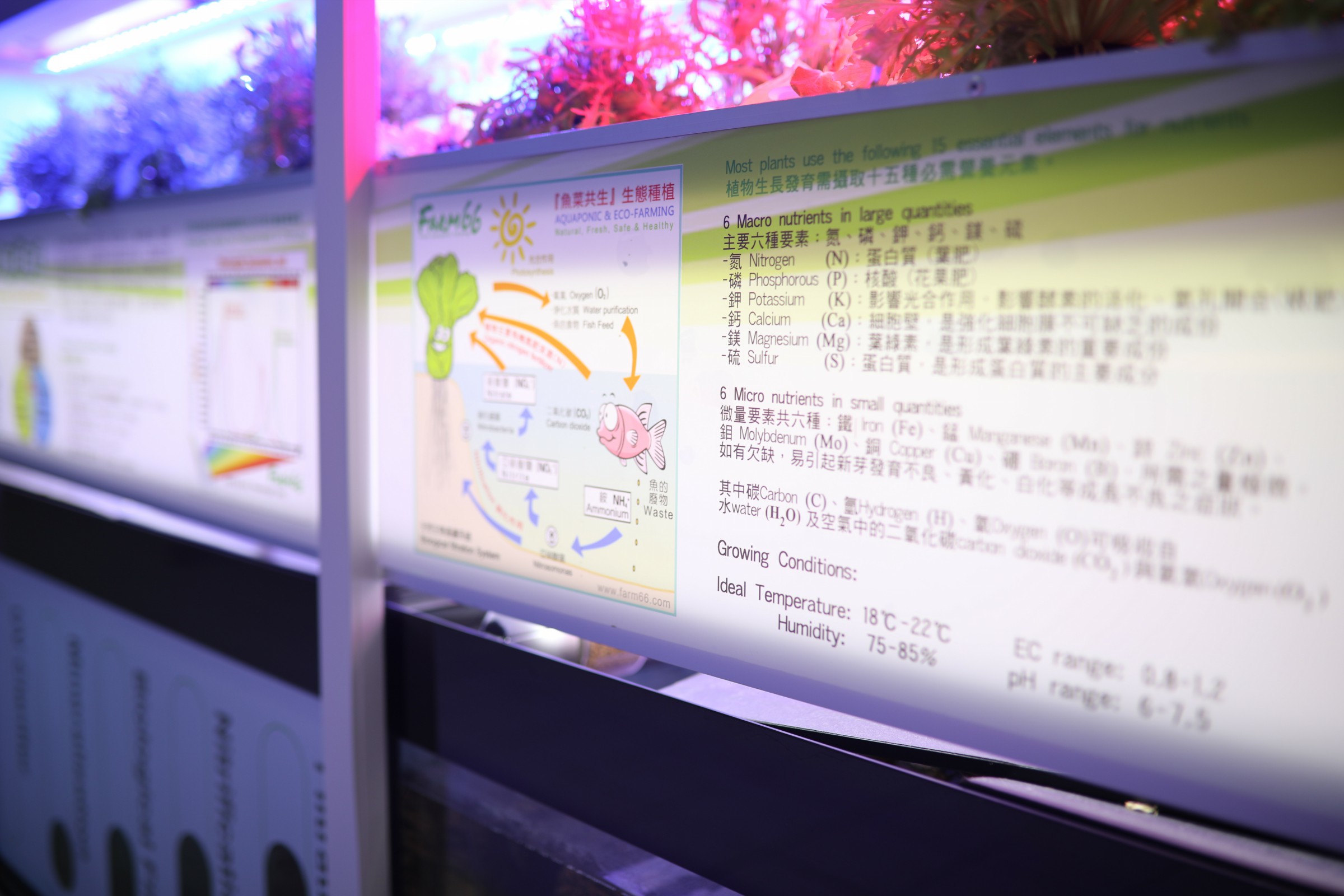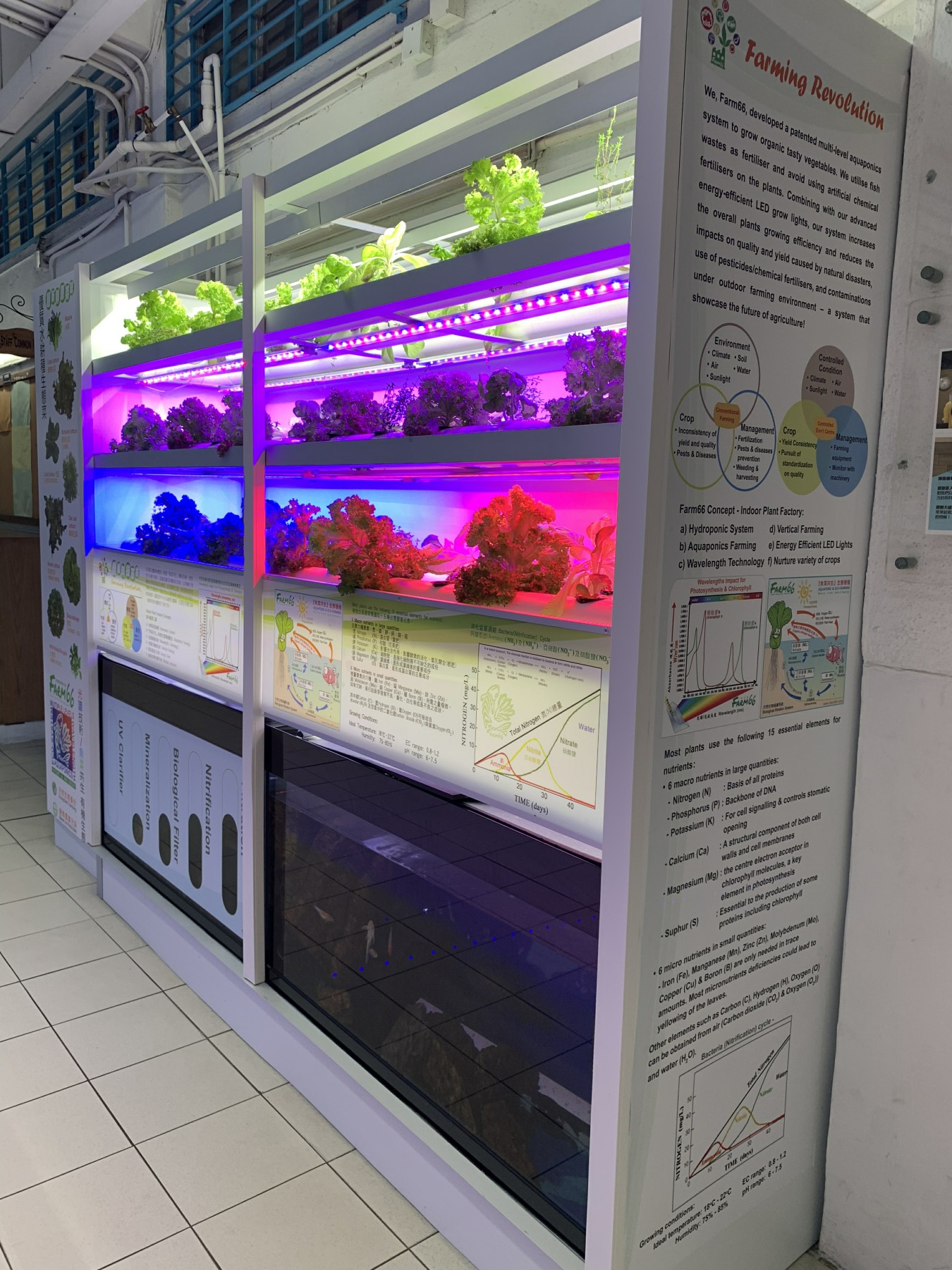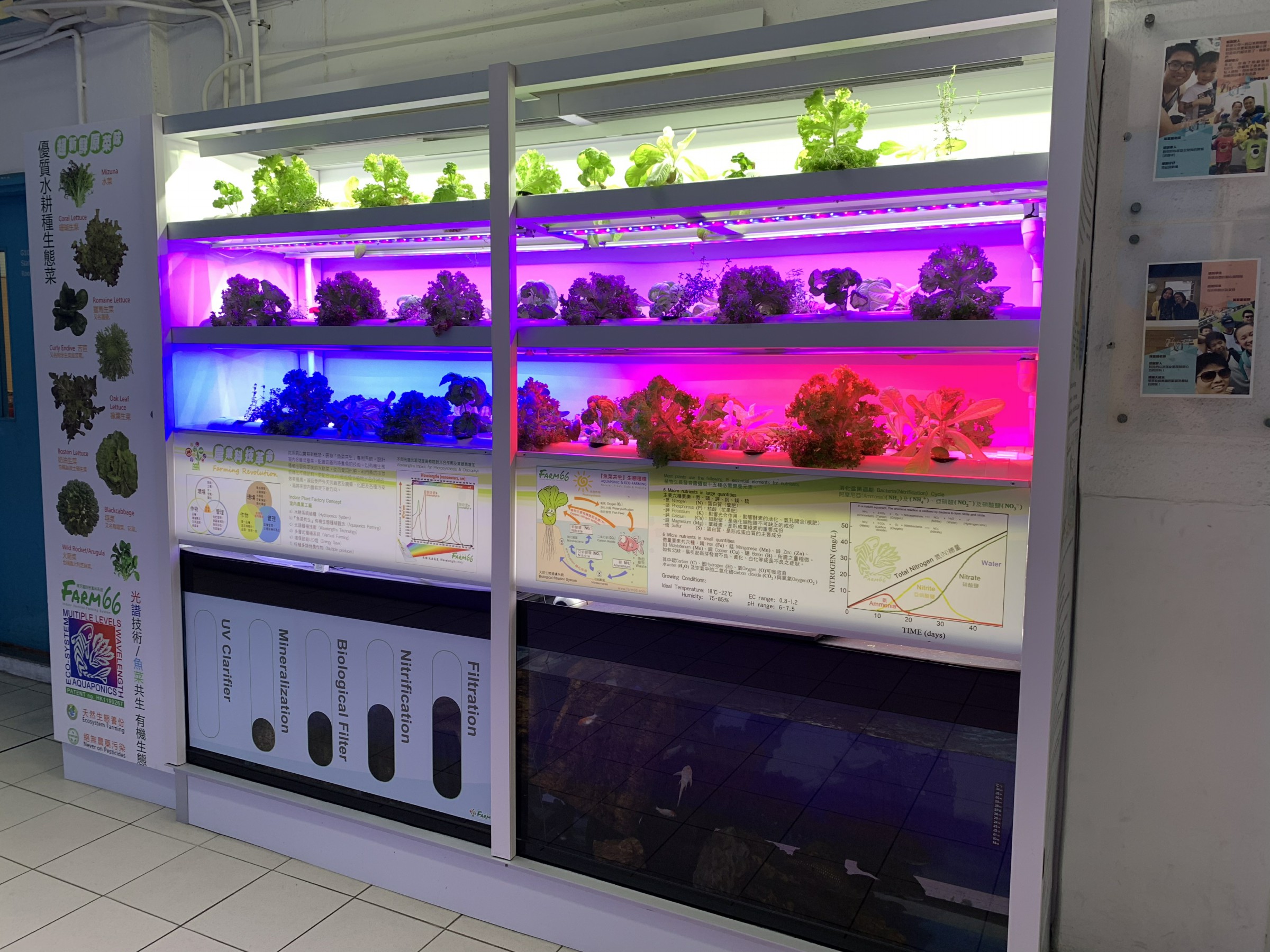 「魚菜共生」有機生態水耕種植體驗室目的為實踐室内生態耕種(Eco-farming),研發全環控種植技及魚菜共生(Aquaponic)概念,生產無蟲無菌無農藥非化肥的優質有機水耕(Hydroponic)農作物。