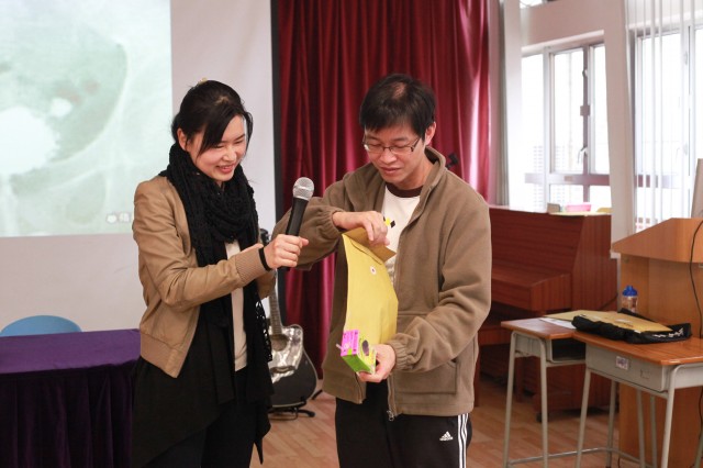 Ms Wong SL and Ms Lui WY demonstrated teaching materials for helping weaker students concerning writing, speaking, and reading.