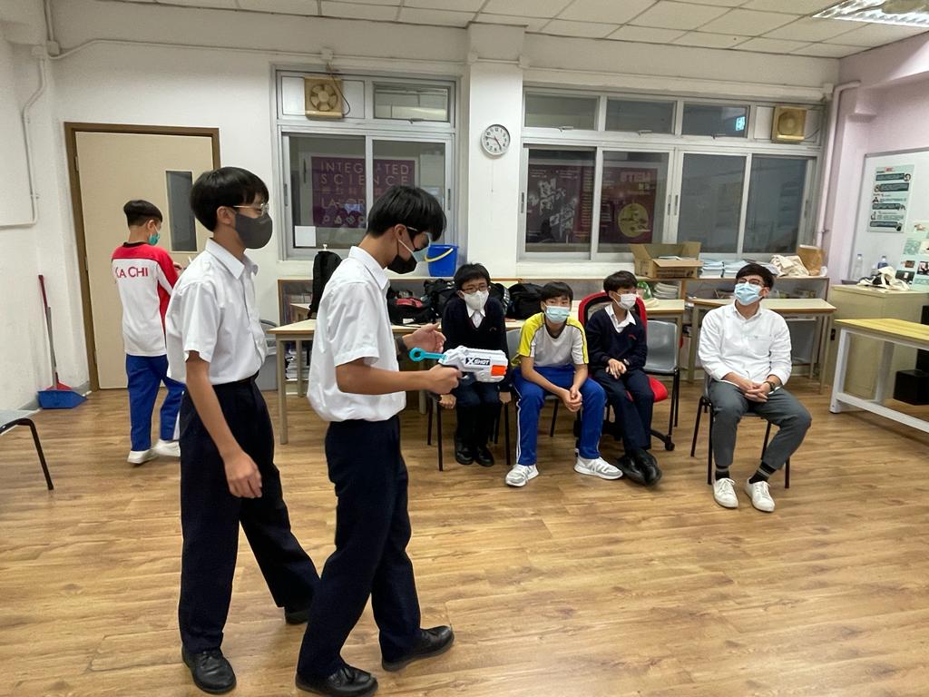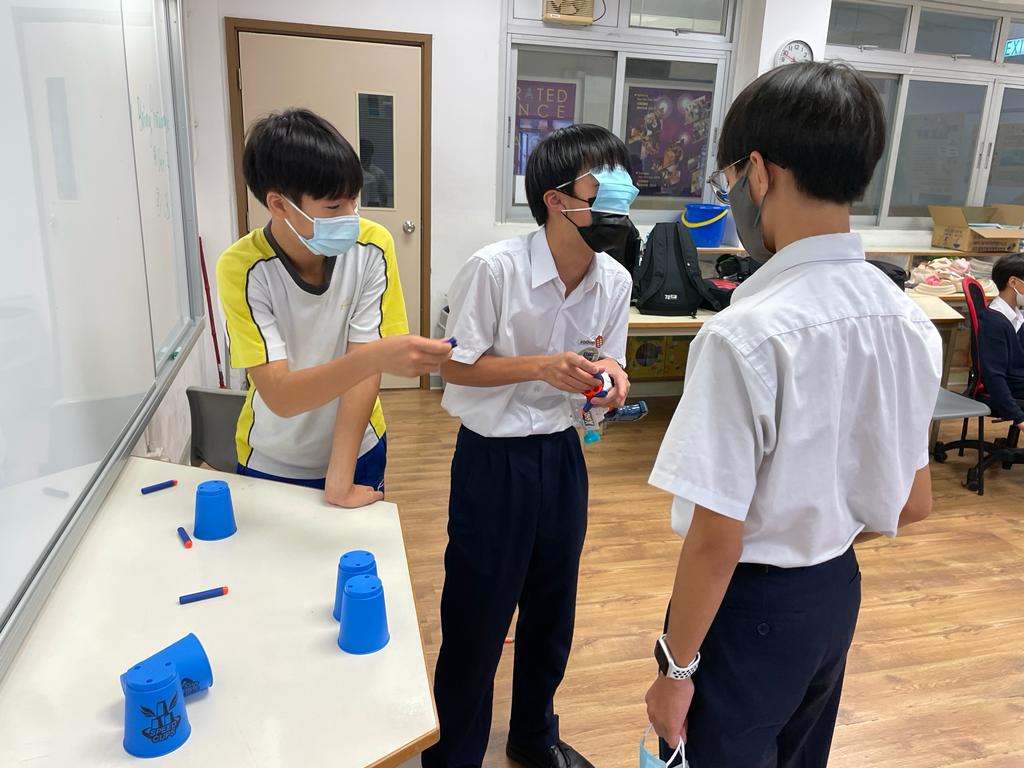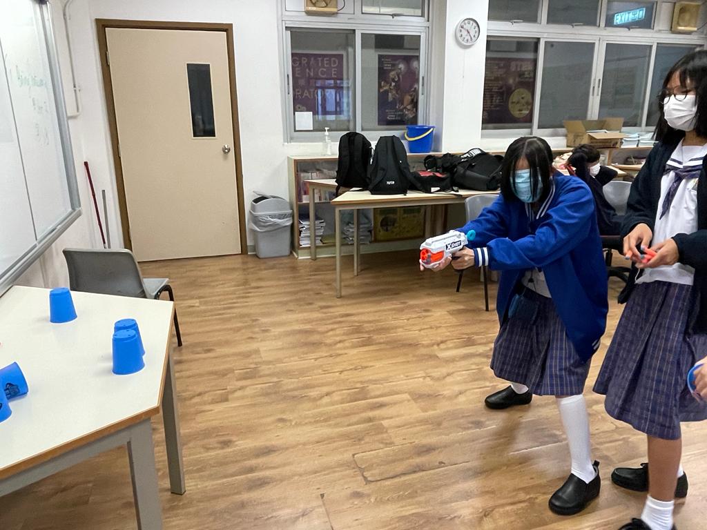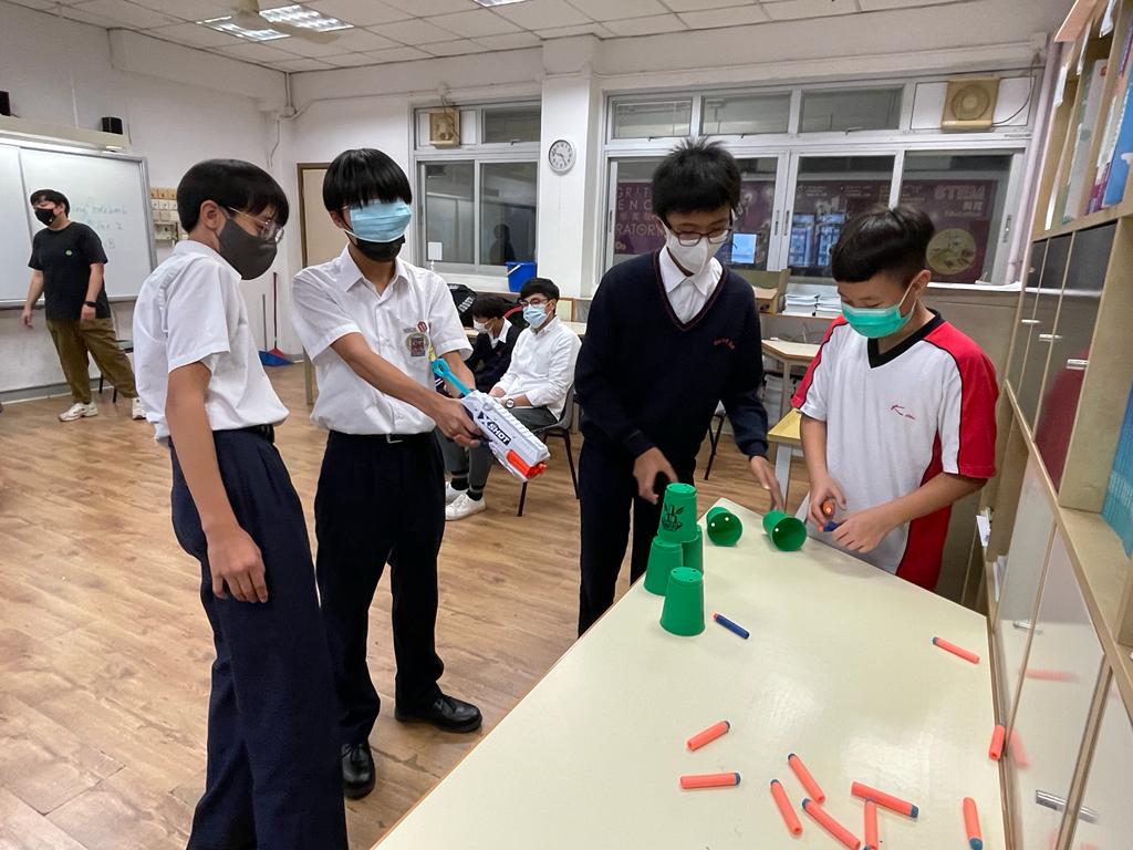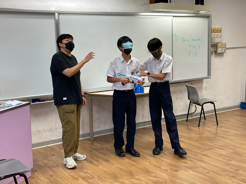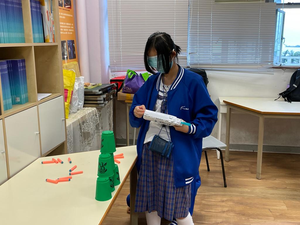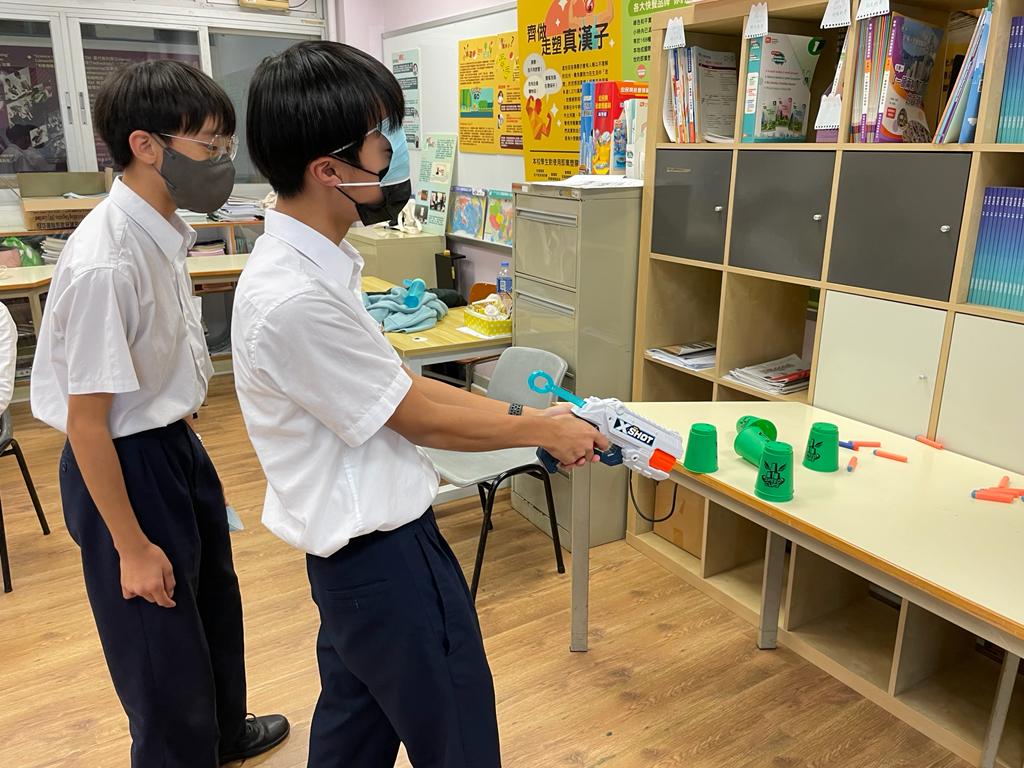 於是次中二成長計劃中,同學有機會在學校進行射擊遊戲,在活動中學習與人相處的溝通能力。十多位同學分成兩組,每組均有一位指揮官負責發出指令,指揮矇眼士兵拿取炮彈,期望以用最準確及最快時間將對方的杯擊倒。在過程中,同學積極給予指令,而士兵即使被矇眼,但在隊友的陪伴下,仍很有信心向前行,大家都盡全力希望完成任務。最後,在反思的時間裡,大家都明白相向溝通的重要,並很欣賞能鍥而不捨堅持到最後的同學,相信他們在未來的日子都能更堅毅的面對不同的挑戰,與同學更融洽相處。