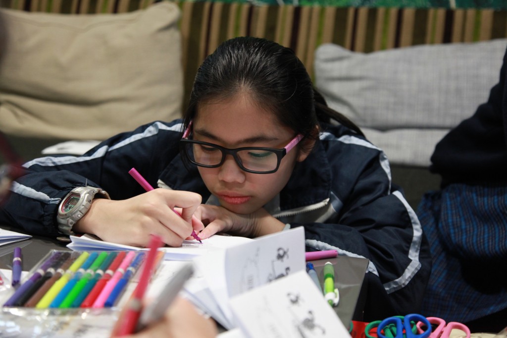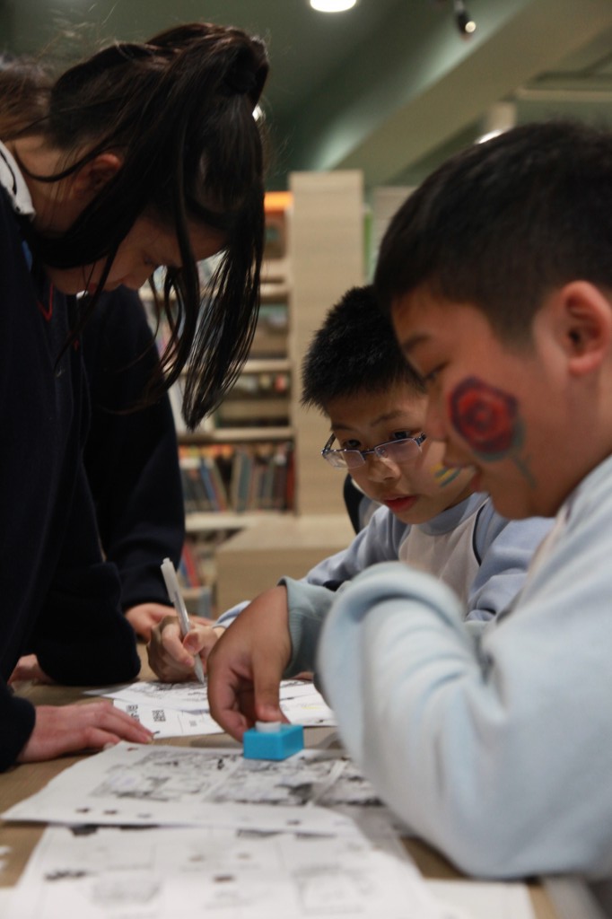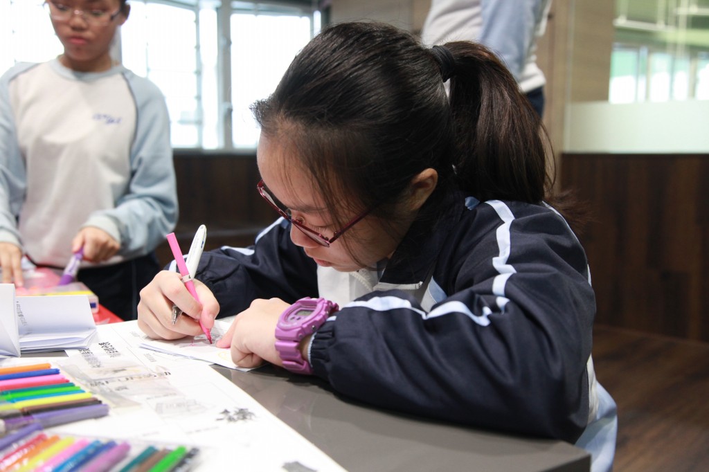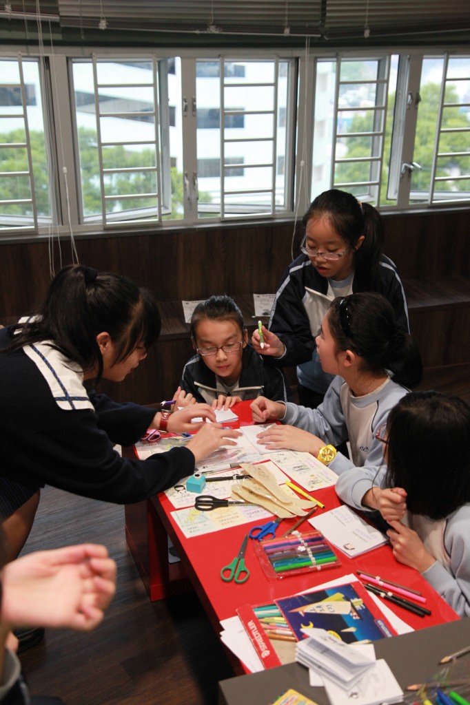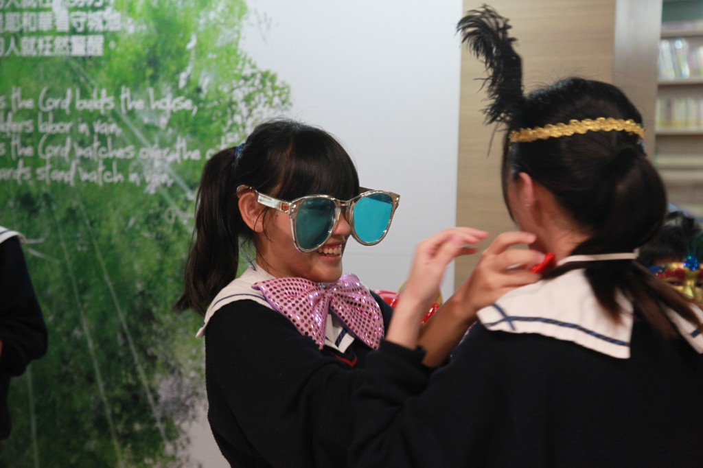 今日,一行十九位來自五邑鄒振猷小學的同學蒞臨本校參觀圖書館,亦於館內參加「與嘉人共享閱讀樂滿FUN」活動,我們一班學生代表與同學們分享一系列別出心裁的閱讀活動,最令女同學流連忘返的必然是燙金書籤製作,而封面人物大翻身的攤位全擁擠著男同學,他們玩得興高采烈,離開之際仍捨不得脫下戲服呢!